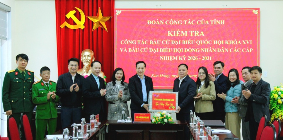 Tại xã Kim Đồng, đoàn công tác trao quà của UBND tỉnh cho Đảng ủy, HĐND, UBND, Ủy ban MTTQ xã; thăm, trao quà Tết cho các gia đình: ông Nông Văn Hán, thương binh 81%, xóm Nặm Nàng; ông Lương Văn Phương và Lương Văn Kết, hộ cận nghèo, xóm Tẻm Tăng.