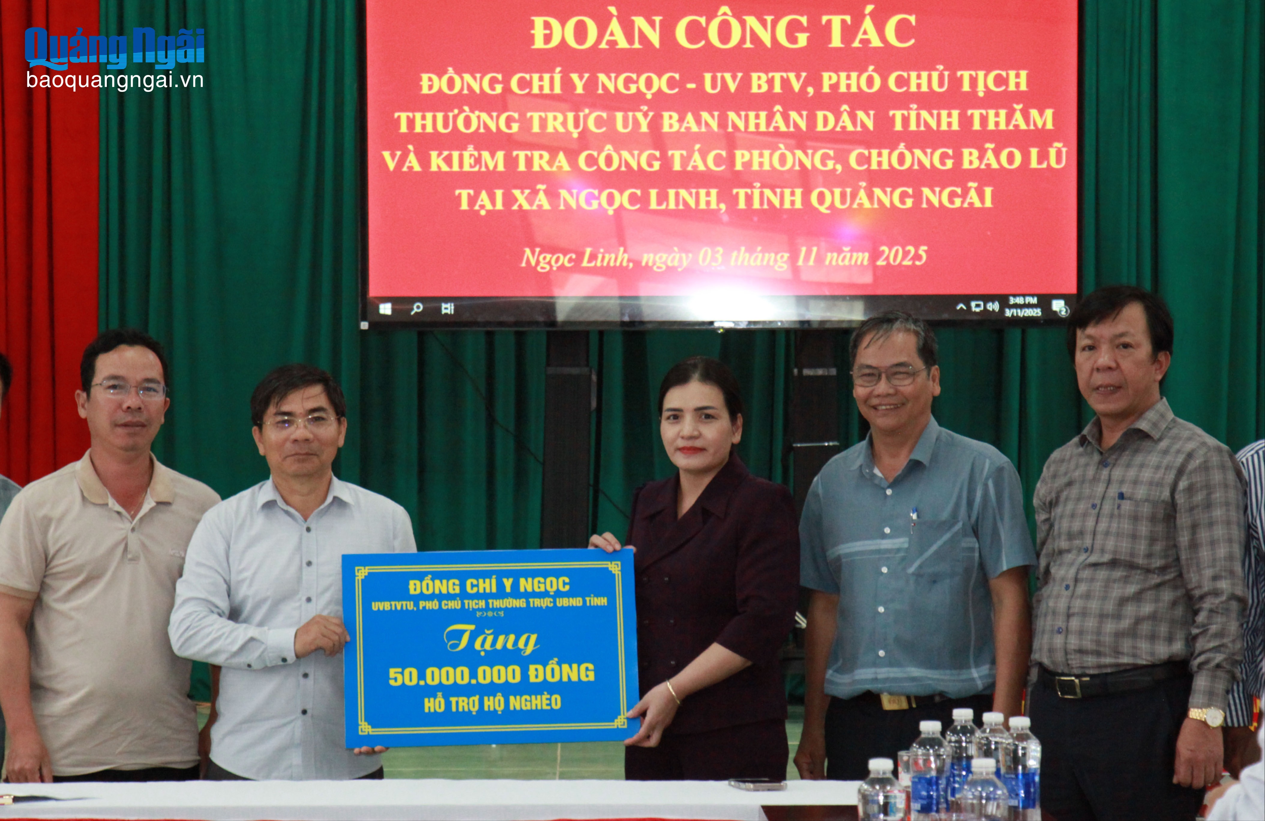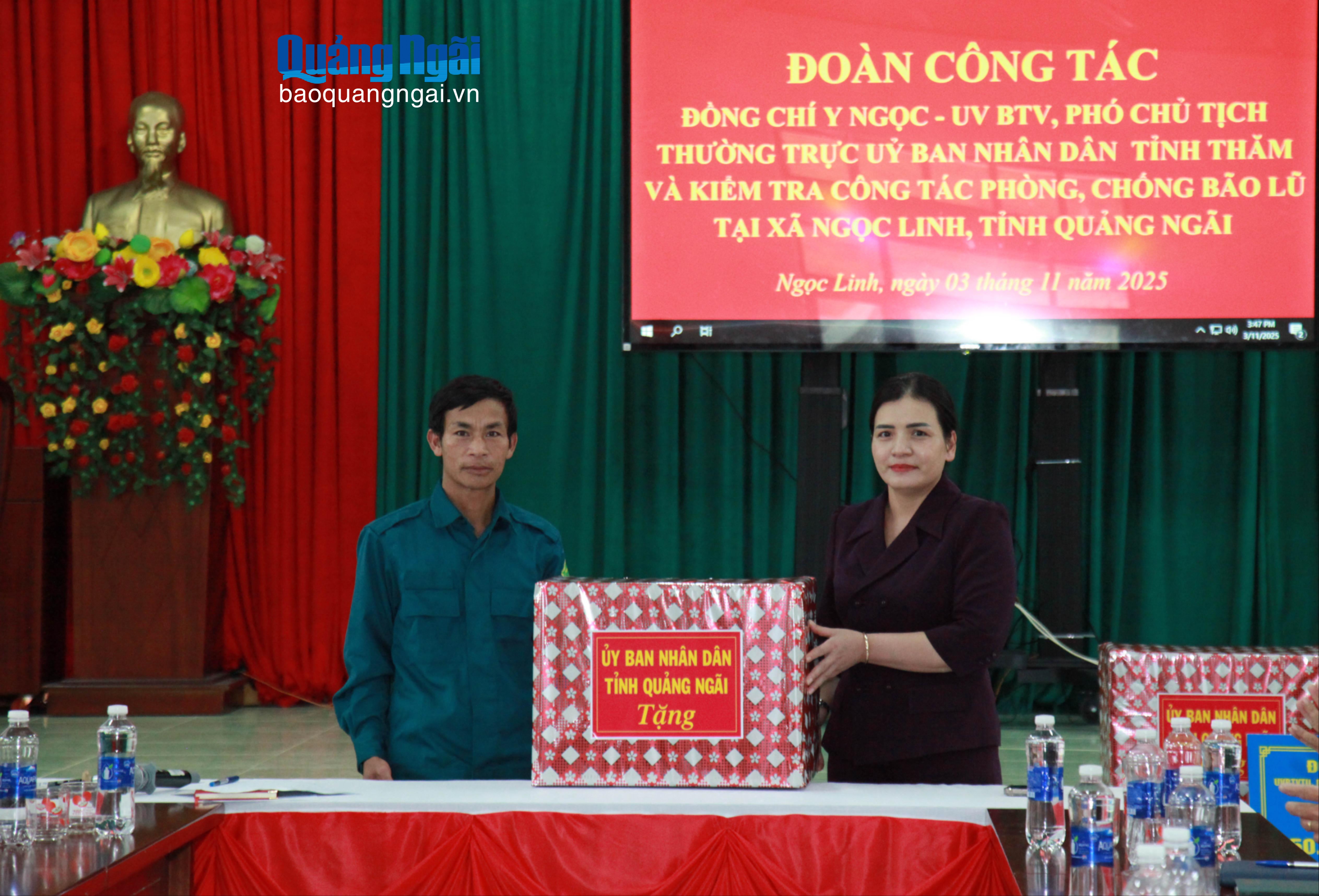 Nhân dịp này, Phó Chủ tịch Thường trực UBND tỉnh Y Ngọc tặng quà cho Đảng ủy, UBND xã Ngọc Linh và đại diện các lực lượng đang tham gia khắc phục hậu quả mưa bão trên địa bàn.
