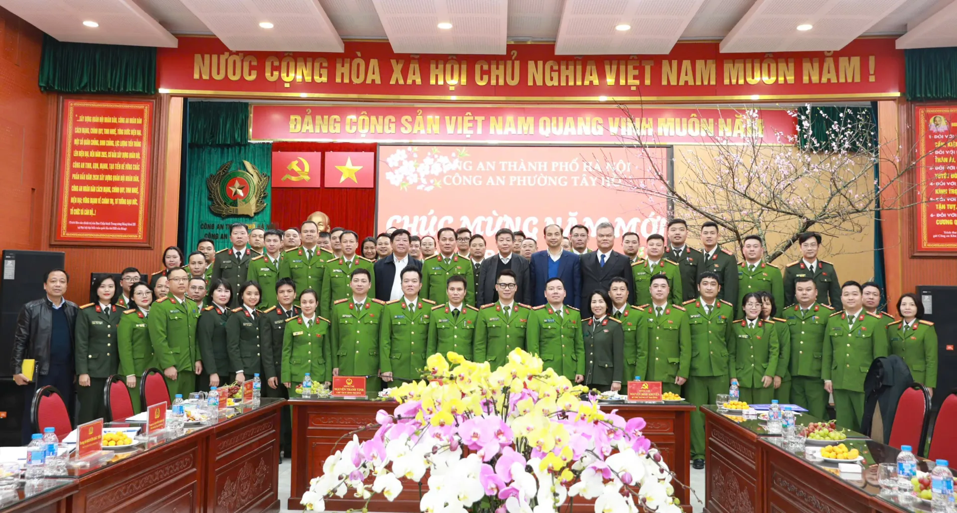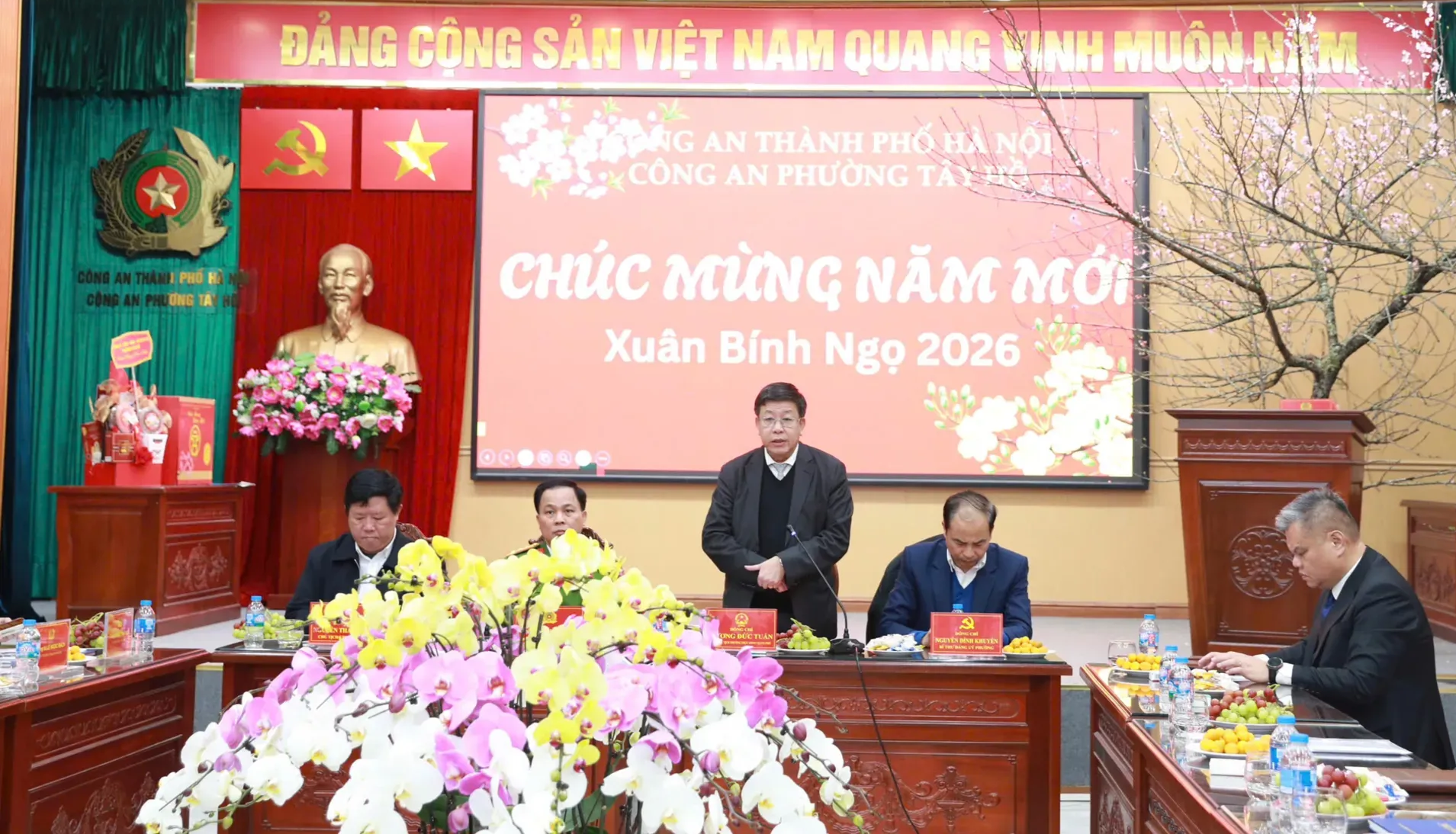 Chiều cùng ngày, Phó Chủ tịch Thường trực UBND TP Dương Đức Tuấn đã đến thăm, chúc Tết cán bộ, chiến sĩ Công an phường Tây Hồ. Tham gia đoàn công tác có Đại tá Lê Văn Tuân - Phó Giám đốc Công an TP Hà Nội cùng đại diện các phòng chức năng thuộc Công an thành phố.