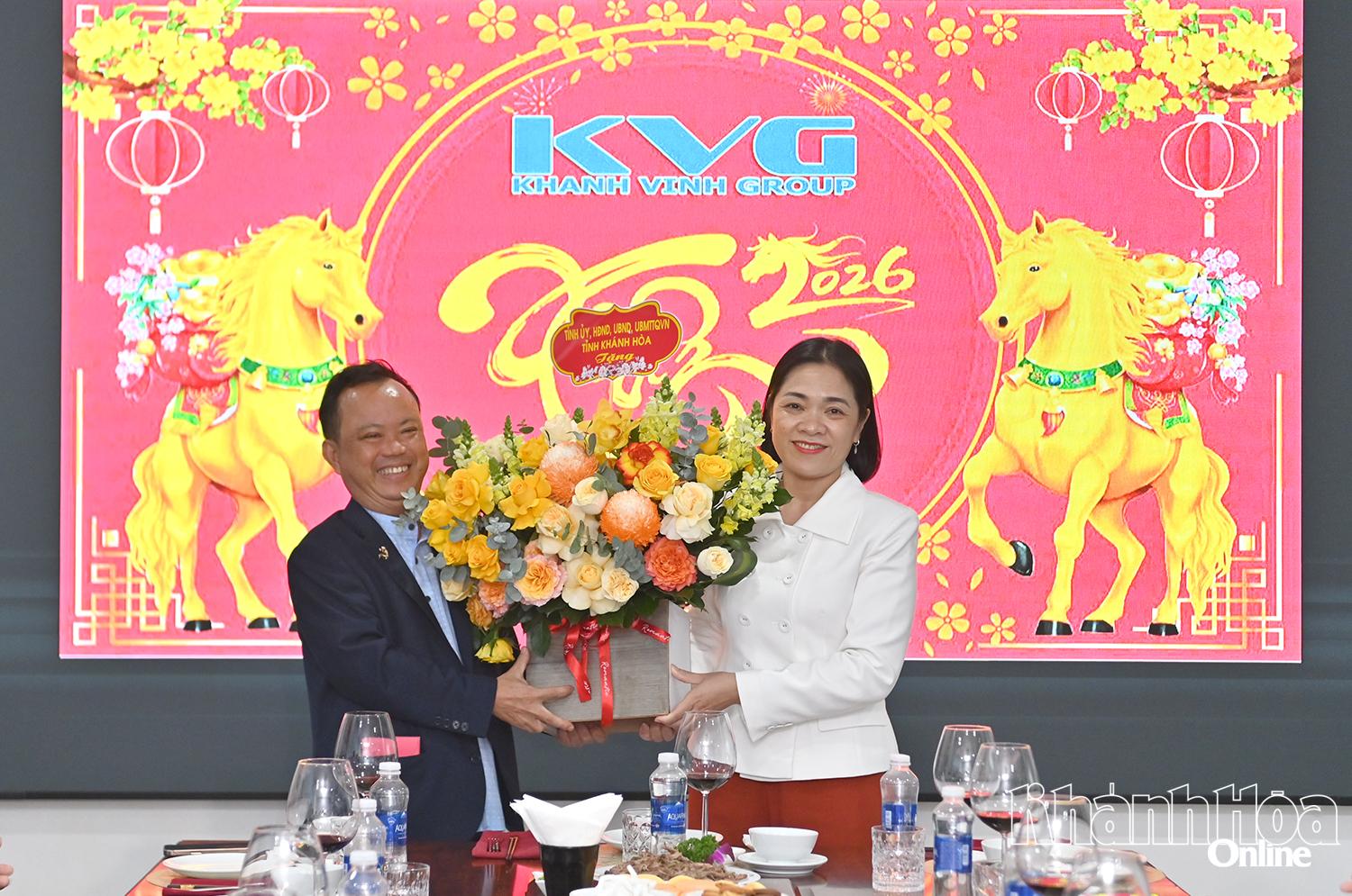 Nhân dịp năm mới Bính Ngọ 2026, thay mặt lãnh đạo Tỉnh ủy, HĐND, UBND, Ủy ban MTTQ Việt Nam tỉnh Khánh Hòa, đồng chí Trần Thu Mai trao tặng lẵng hoa chúc mừng các doanh nghiệp trong ngày làm việc đầu tiên sau kỳ nghỉ Tết Nguyên đán.