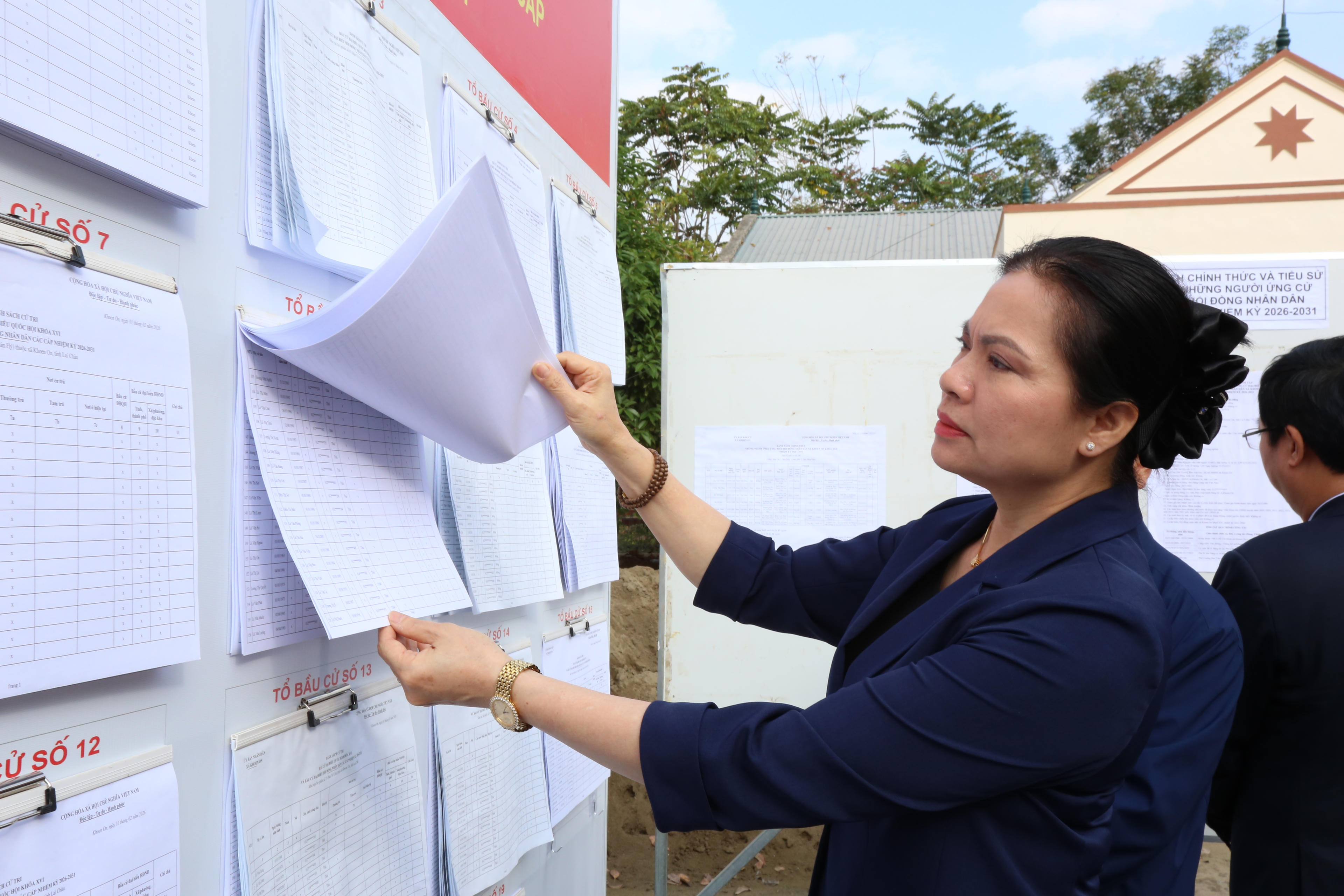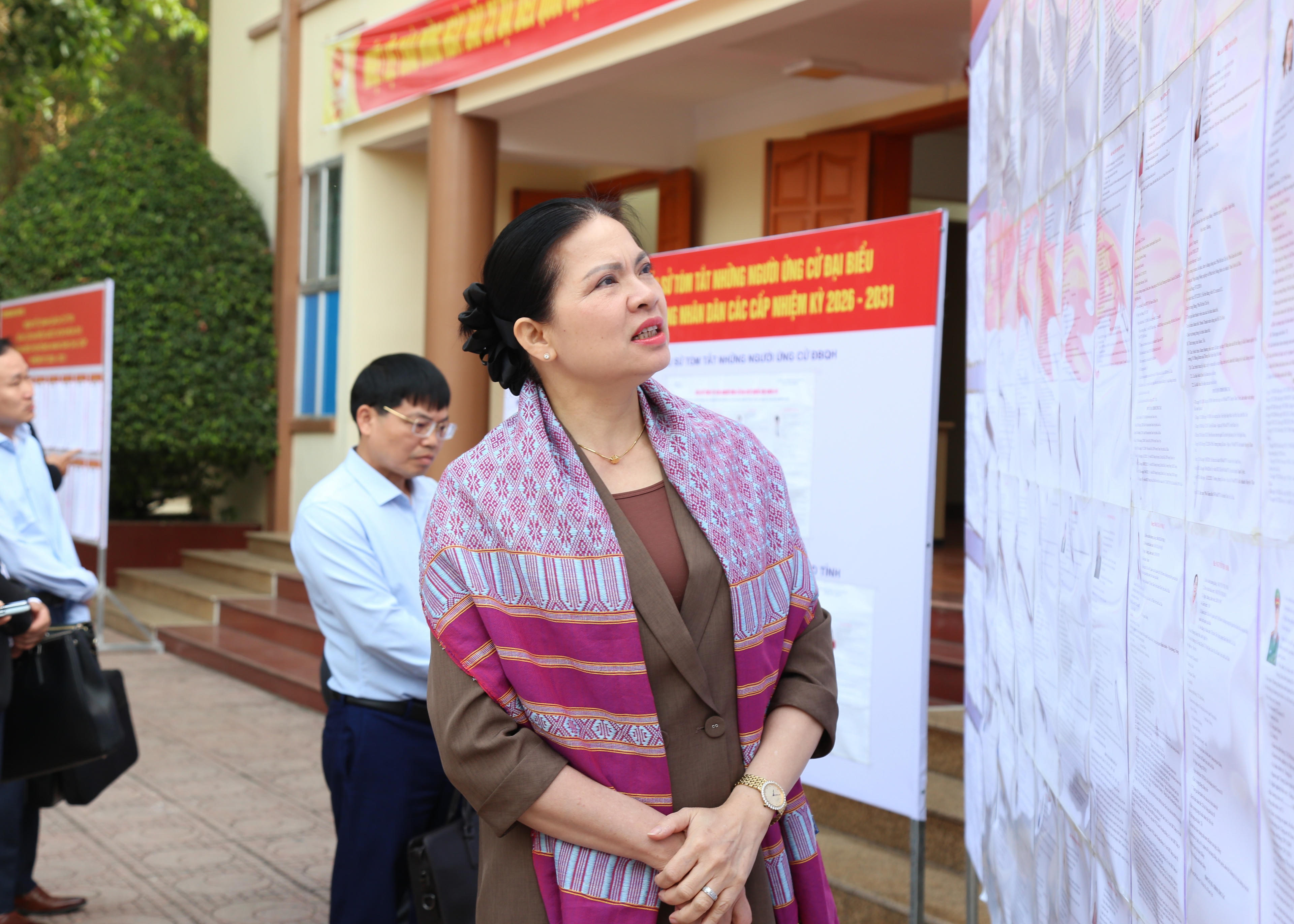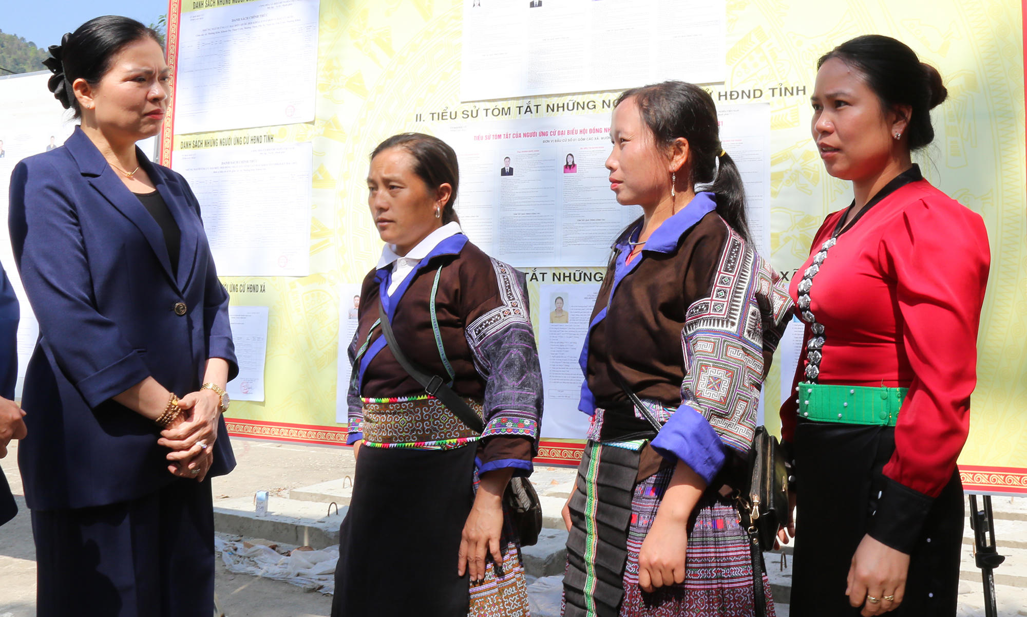 Phó Chủ tịch - Tổng Thư ký Ủy ban Trung ương MTTQ Việt Nam Hà Thị Nga trực tiếp xem danh sách, tìm hiểu kỹ tiểu sử các ứng cử viên đại biểu Quốc hội và HĐND các cấp tại các điểm tiếp xúc cử tri ở Lai Châu.