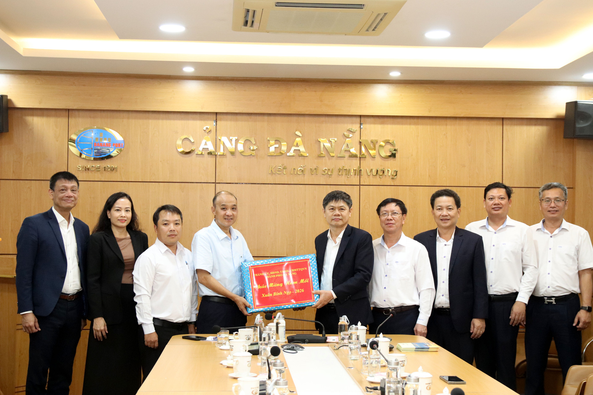 Phó Chủ tịch UBND thành phố Lê Quang Nam (thứ 4, bên trái sang) tặng quà, chúc Tết cán bộ, lãnh đạo, nhân viên Cảng Đà Nẵng. Ảnh: TRỌNG HUY