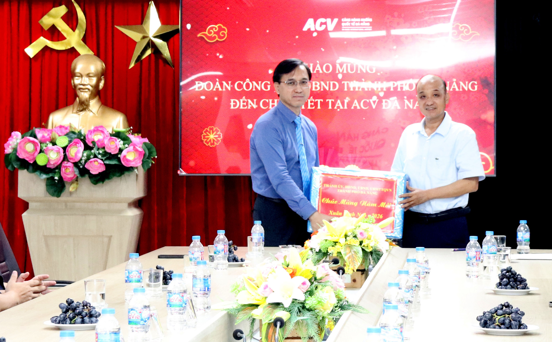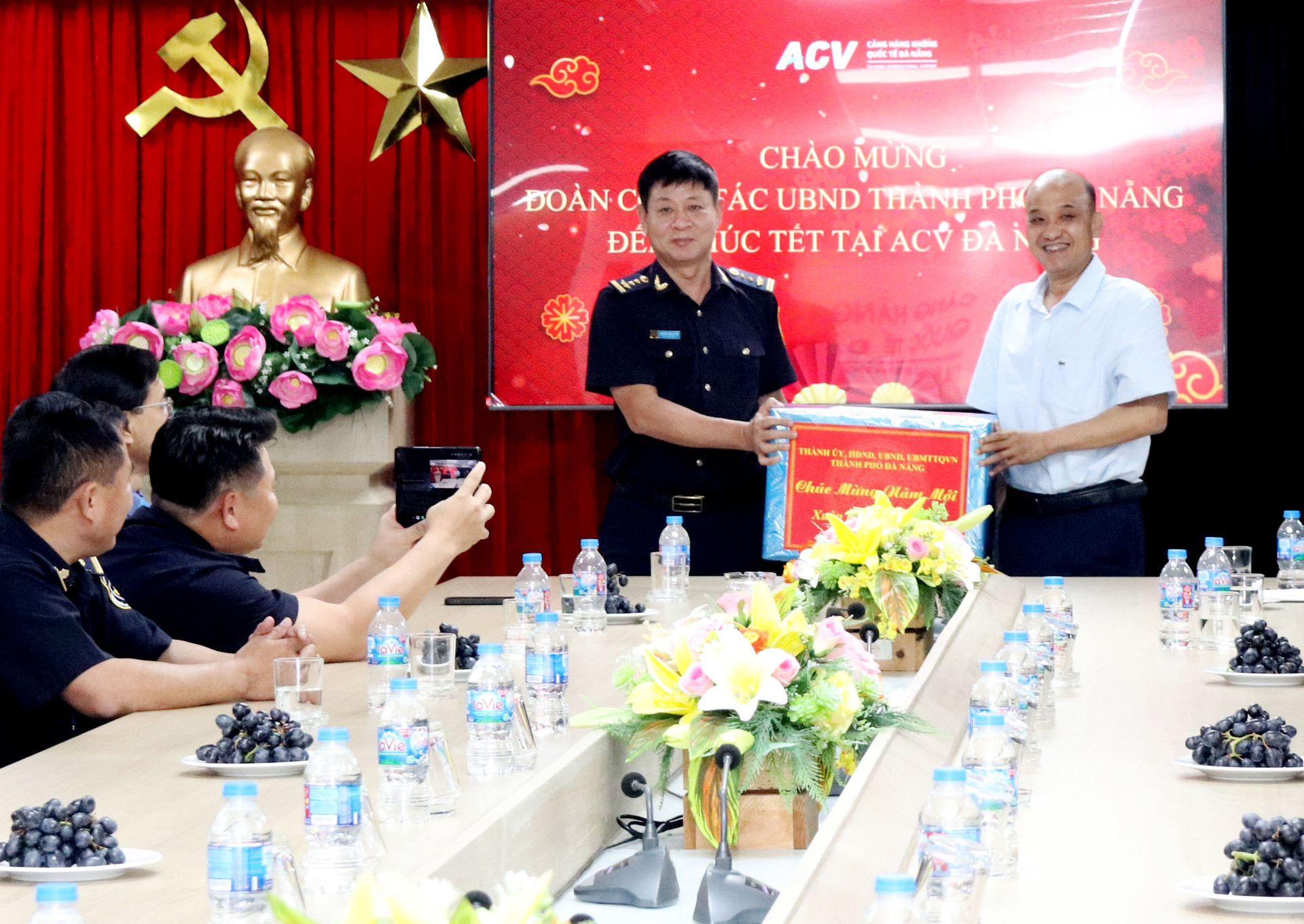 Phó Chủ tịch UBND thành phố Lê Quang Nam (bên phải) thăm, chúc Tết Cảng Hàng không quốc tế Đà Nẵng. Ảnh: TRỌNG HUY