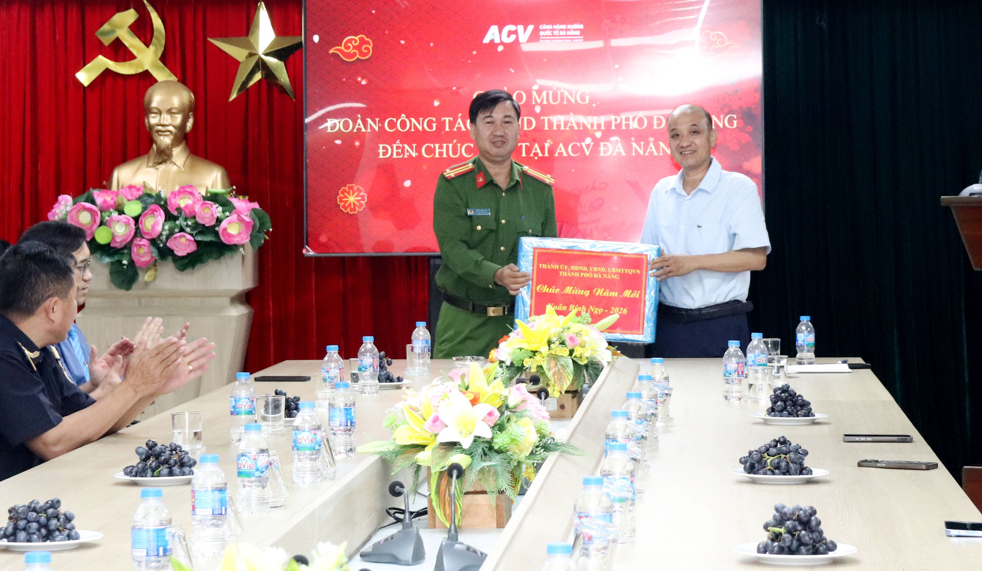 Phó Chủ tịch UBND thành phố Lê Quang Nam (bên phải) thăm, chúc Tết Đồn Công an Cảng Hàng không quốc tế Đà Nẵng. Ảnh: TRỌNG HUY