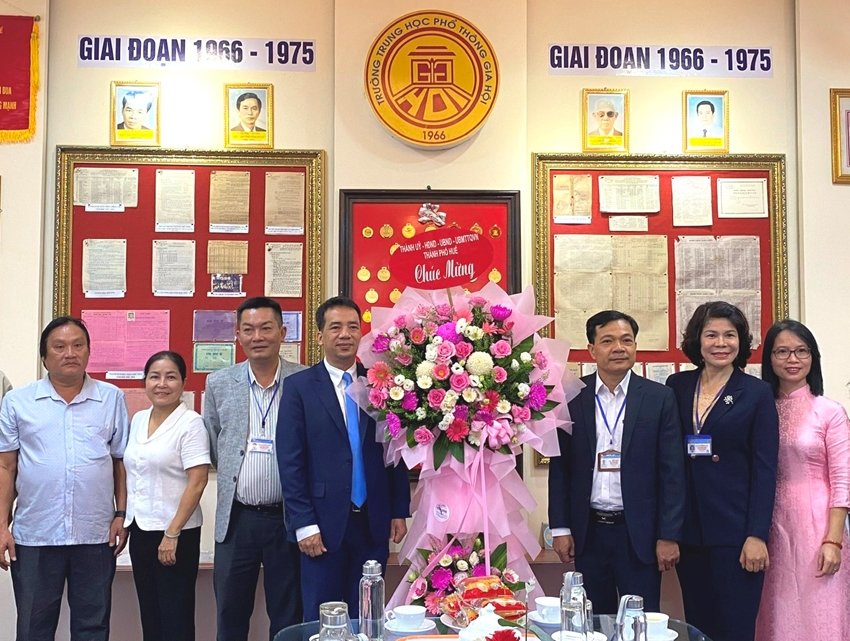 Phó Chủ tịch UBND thành phố Trần Hữu Thùy Giang tặng hoa chúc mừng tập thể giáo viên Trường THPT Gia Hội