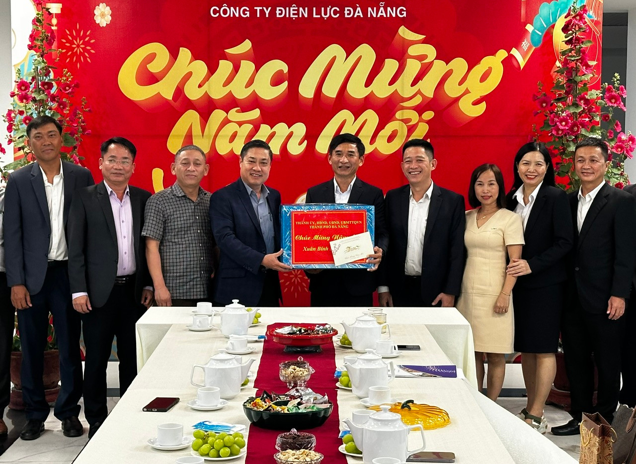 Phó Chủ tịch UBND thành phố Phan Thái Bình (thứ 4, bên trái sang) tặng quà Tết cho Công ty Điện lực Đà Nẵng. ẢNH: XUÂN HIẾU