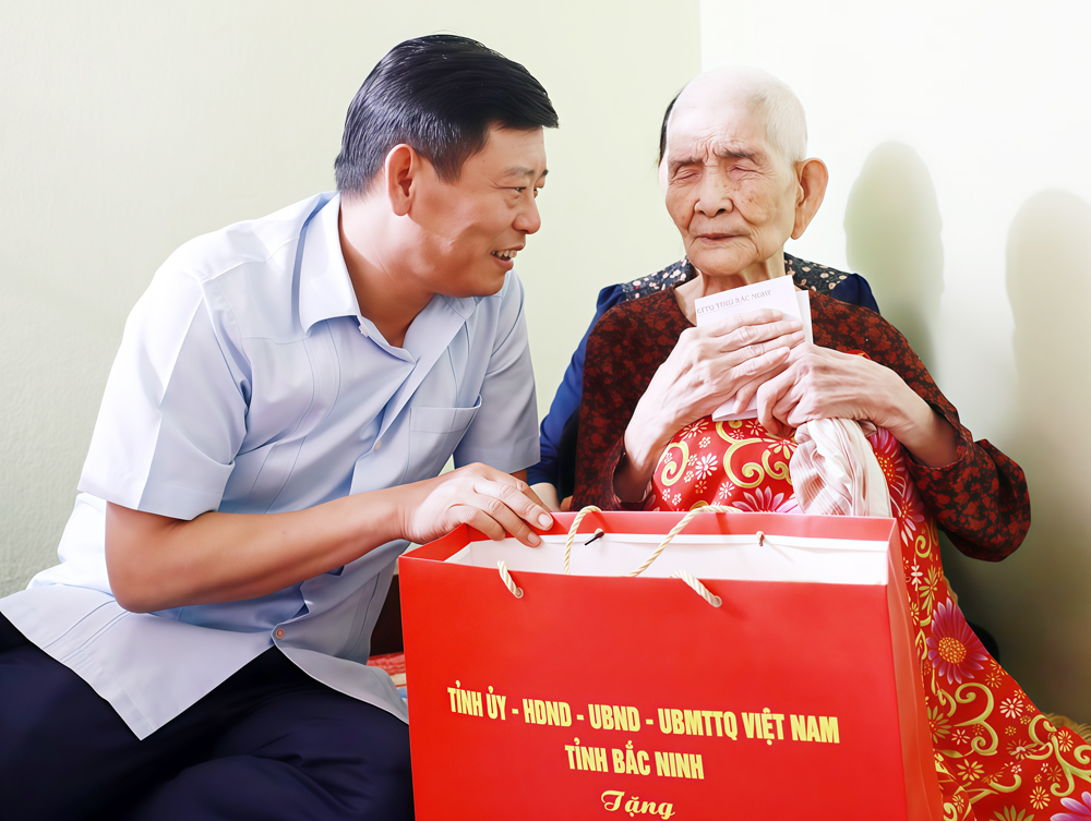 Đồng chí Ngô Tân Phượng và lãnh đạo Sở Y tế, Hội Người cao tuổi tỉnh tặng quà cụ Hoàng Thị Bài.