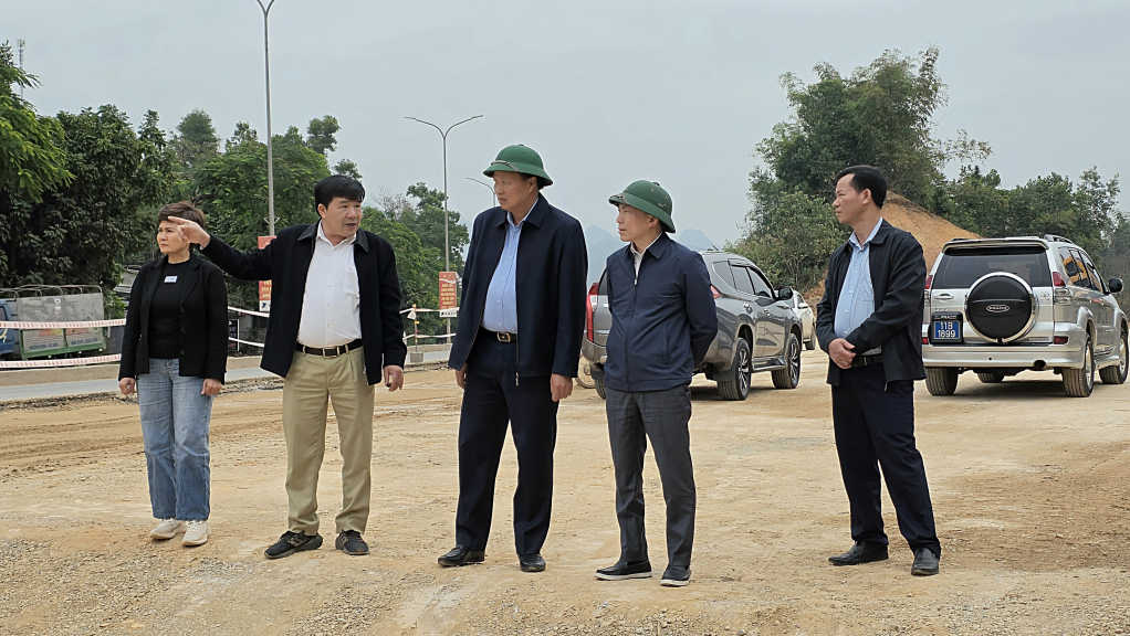 Phó Chủ tịch UBND tỉnh Hoàng Văn Thạch kiểm tra, đôn đốc tiến độ thi công tại điểm cuối của dự án (vị trí km7+500) tại phường Thục Phán.