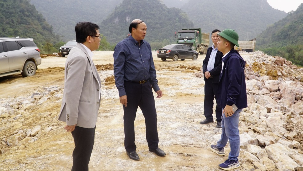 Phó Chủ tịch UBND tỉnh Hoàng Văn Thạch kiểm tra tiến độ thi công cao tốc Đồng Đăng - Trà Lĩnh tại Kn55 + 800 qua địa phận xã Đông Khê.