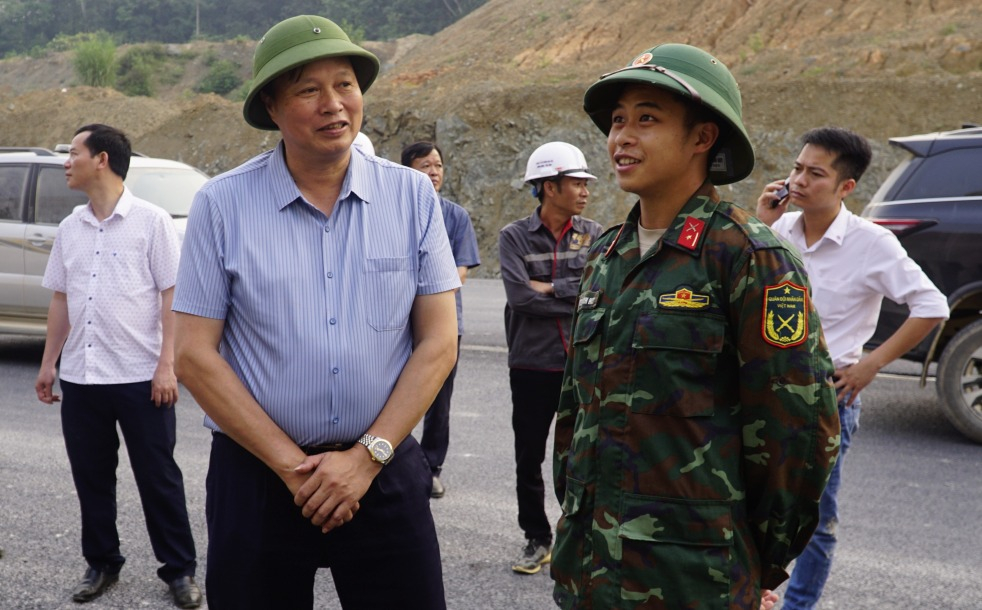 Phó Chủ tịch UBND tỉnh Hoàng Văn Thạch động viên các chiến sĩ Trung đoàn 141, Sư đoàn 3, Quân khu 1 đang tham gia thực hiện dự án.