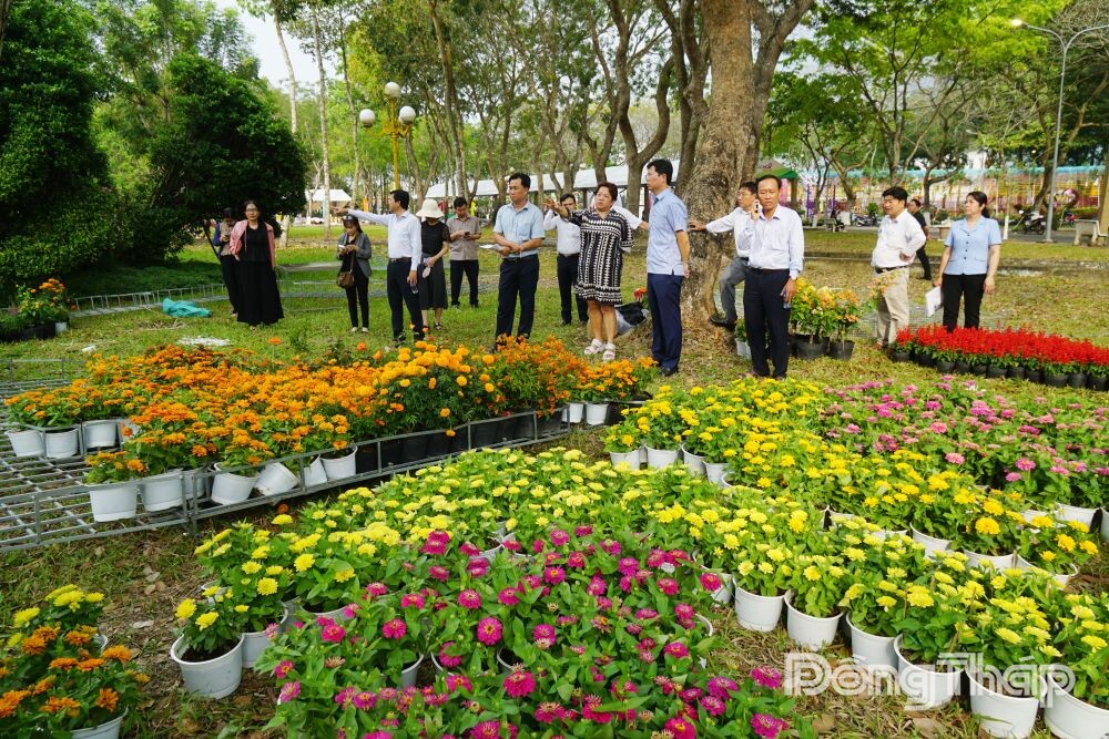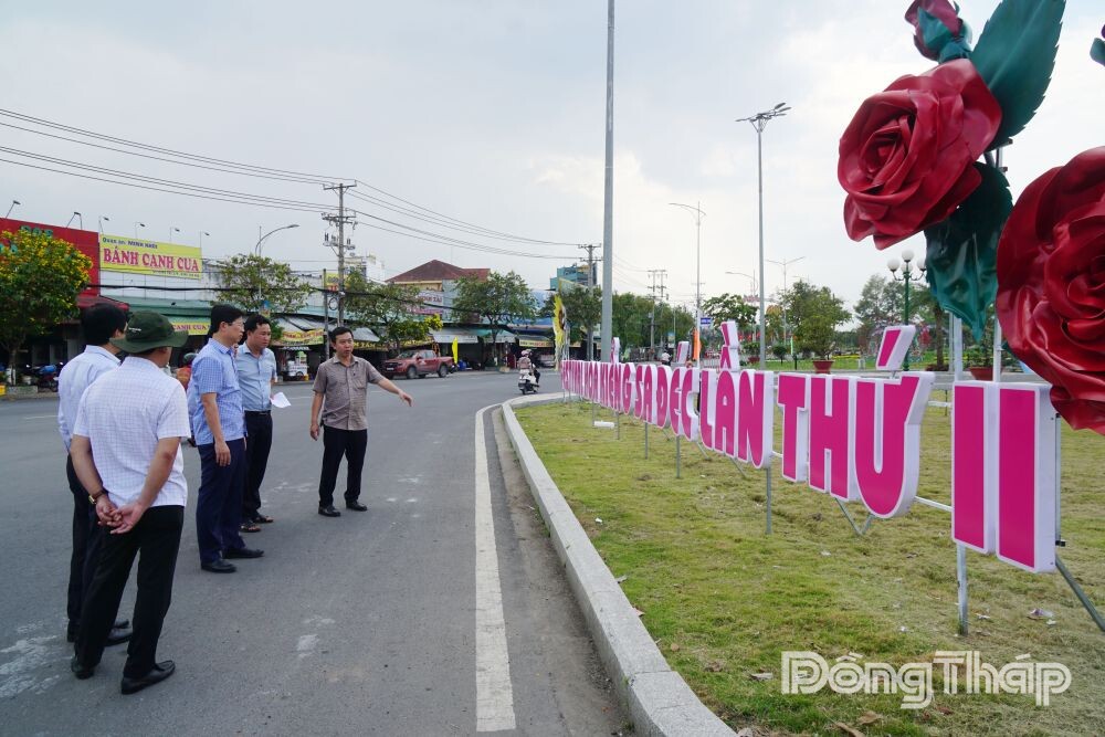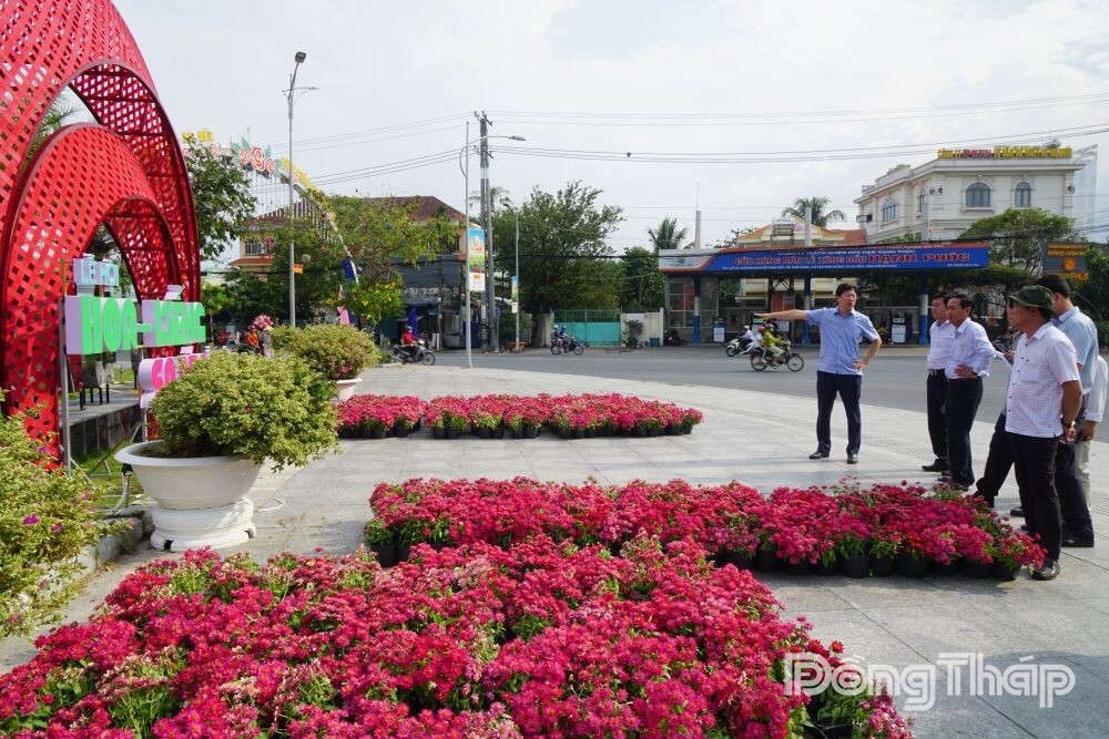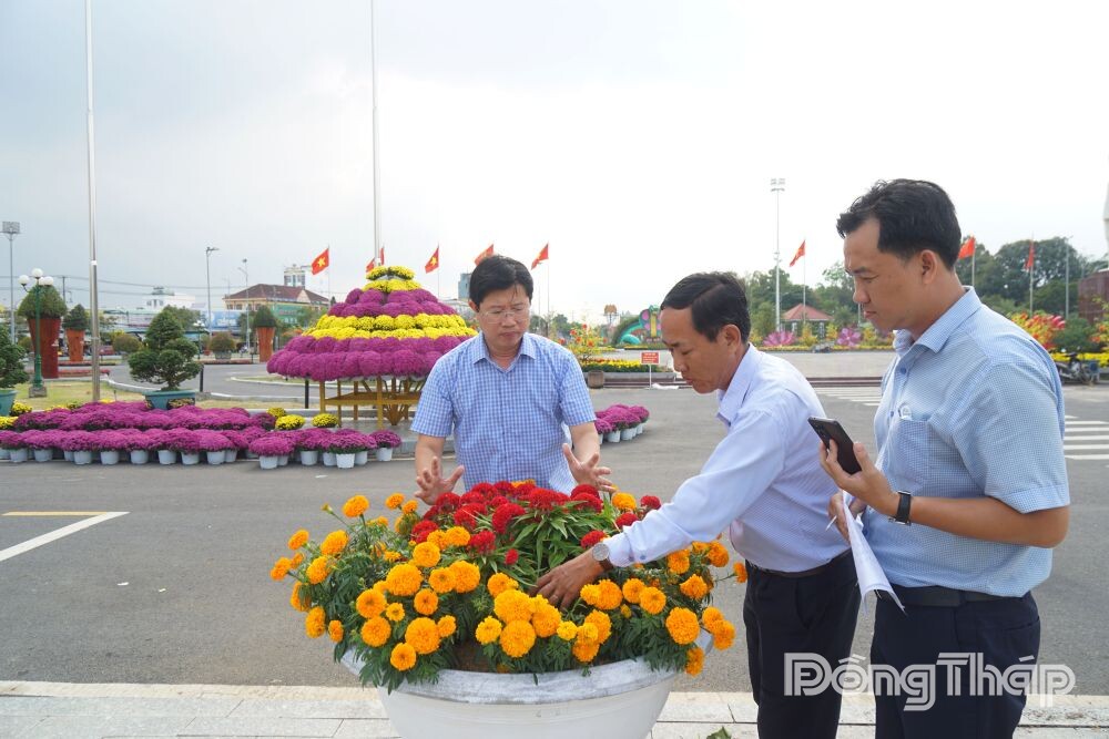 Kiểm tra các giỏ hoa và tiểu cảnh tại quảng trường, lãnh đạo tỉnh yêu cầu tuyển chọn những giống hoa rực rỡ nhất, đặc trưng của Làng hoa Sa Đéc để trưng bày.