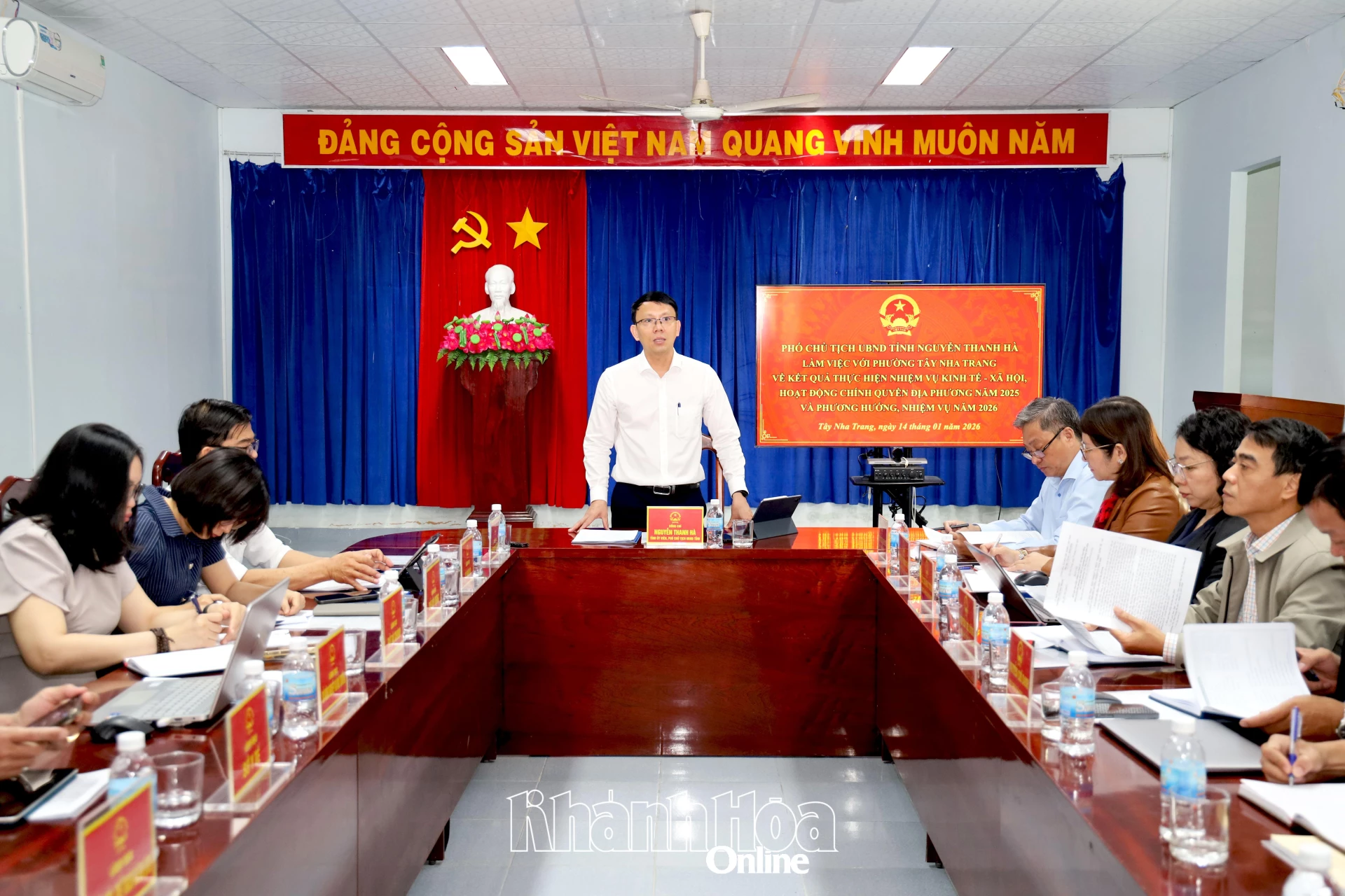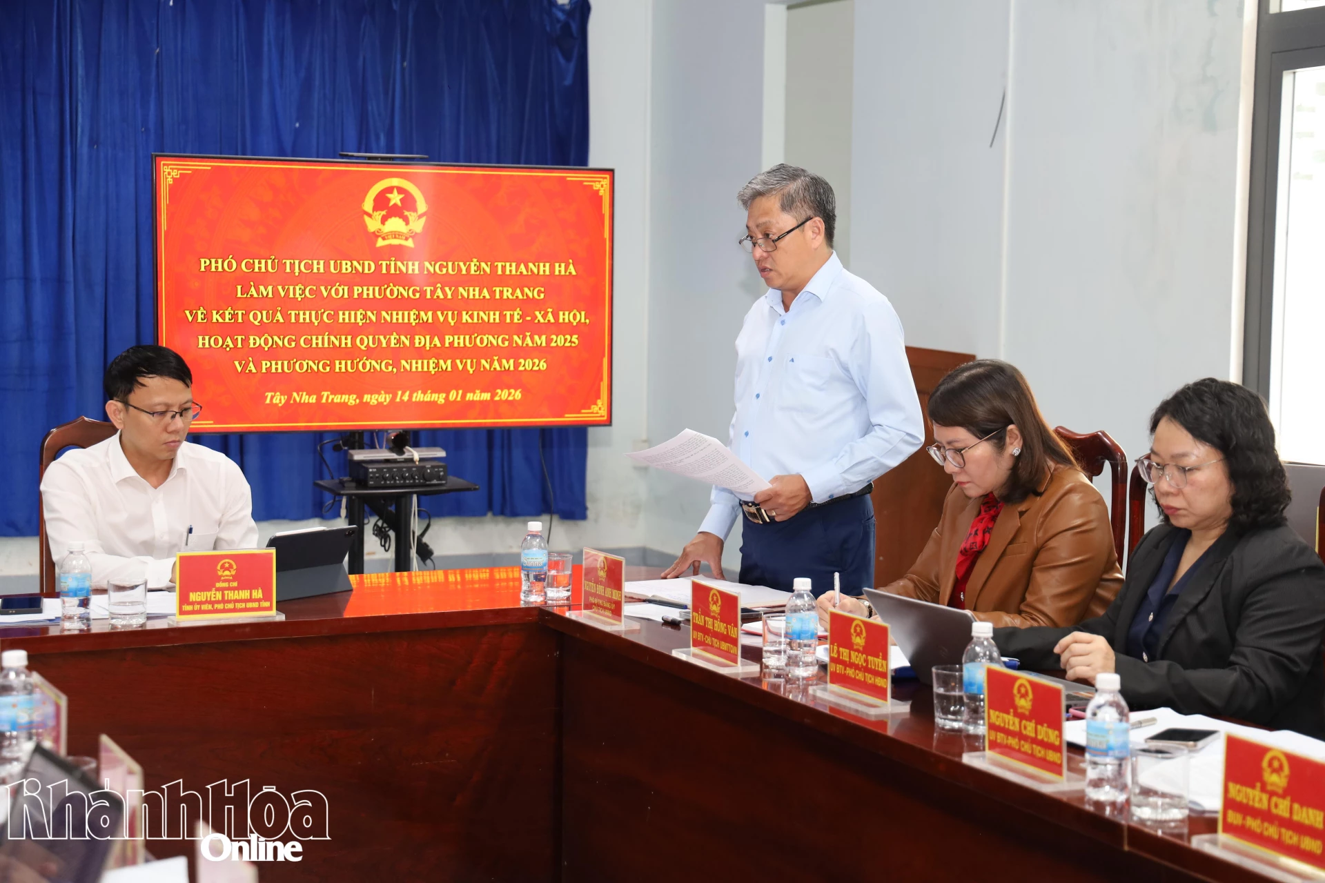 Sáng 14-1, đồng chí Nguyễn Thanh Hà - Phó Chủ tịch UBND tỉnh Khánh Hòa làm việc với phường Tây Nha Trang về kết quả thực hiện nhiệm vụ kinh tế - xã hội, hoạt động chính quyền địa phương năm 2025 và phương hướng, nhiệm vụ năm 2026.
