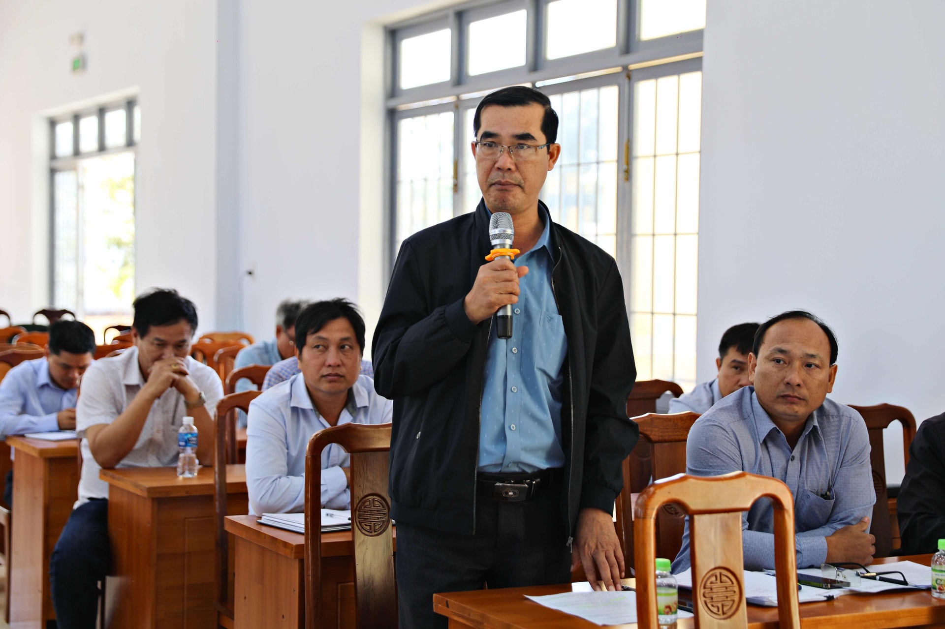 Sau khi kết thúc kiểm tra hiện trường toàn tuyến dự án, Phó Chủ tịch UBND tỉnh Lâm Đồng Võ Ngọc Hiệp có buổi làm việc với chủ đầu tư, các đơn vị liên quan để nghe báo cáo tiến độ GPMB, thi công của Dự án tại trụ sở xã Ninh Gia. Ảnh: Chính Thành