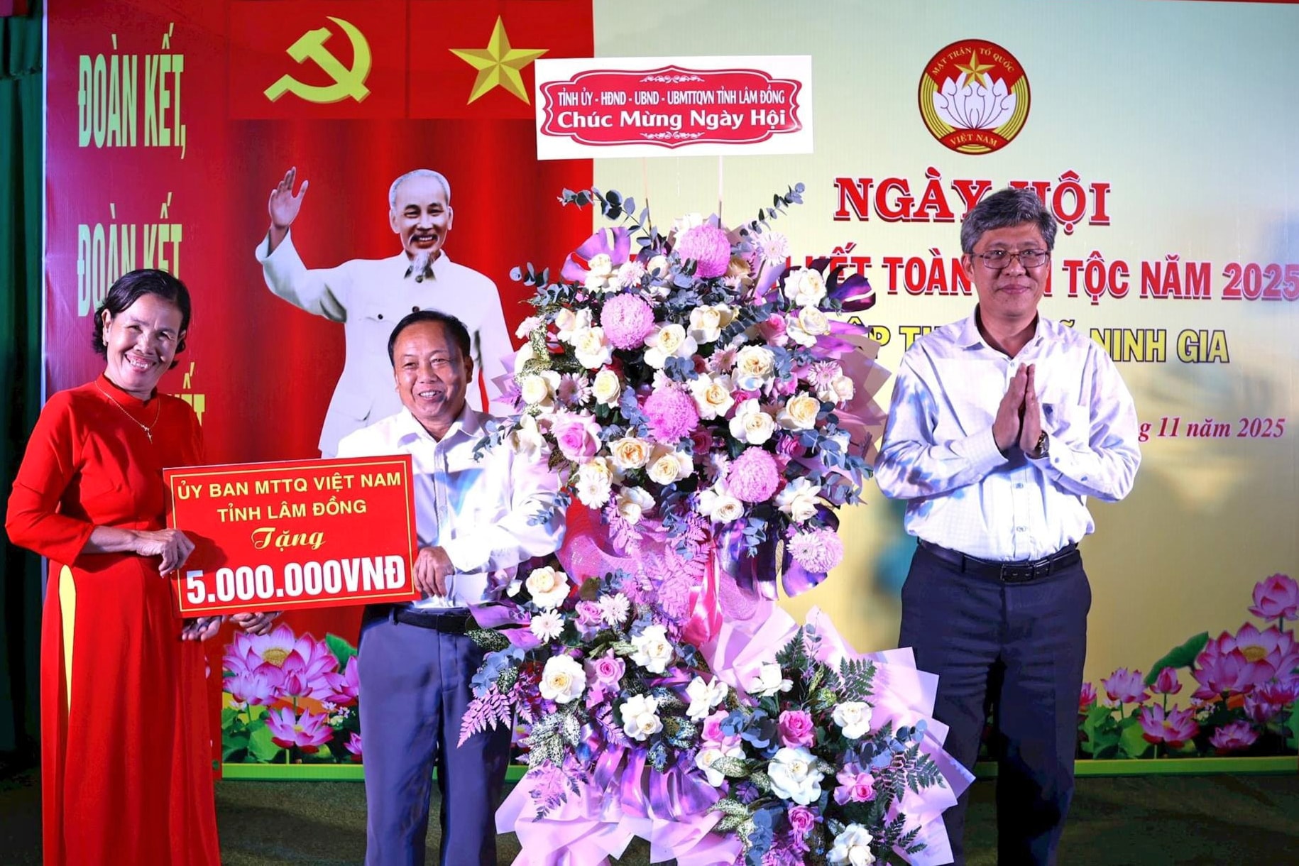 Đồng chí Nguyễn Minh, TUV, Phó Chủ tịch UBND tỉnh Lâm Đồng tặng hoa và quà cho cán bộ và Nhân dân thôn Hiệp Thuận