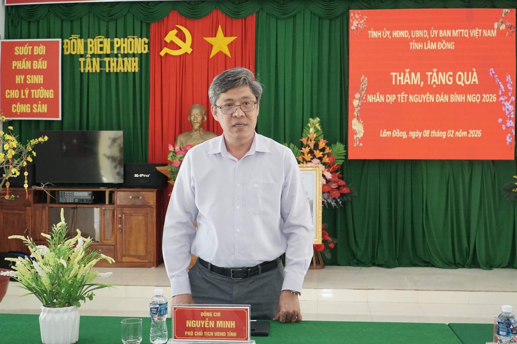 Phó Chủ tịch UBND tỉnh Lâm Đồng Nguyễn Minh phát biểu tại buổi đến thăm, chúc Tết cán bộ, chiến sĩ Đồn Biên phòng Tân Thành