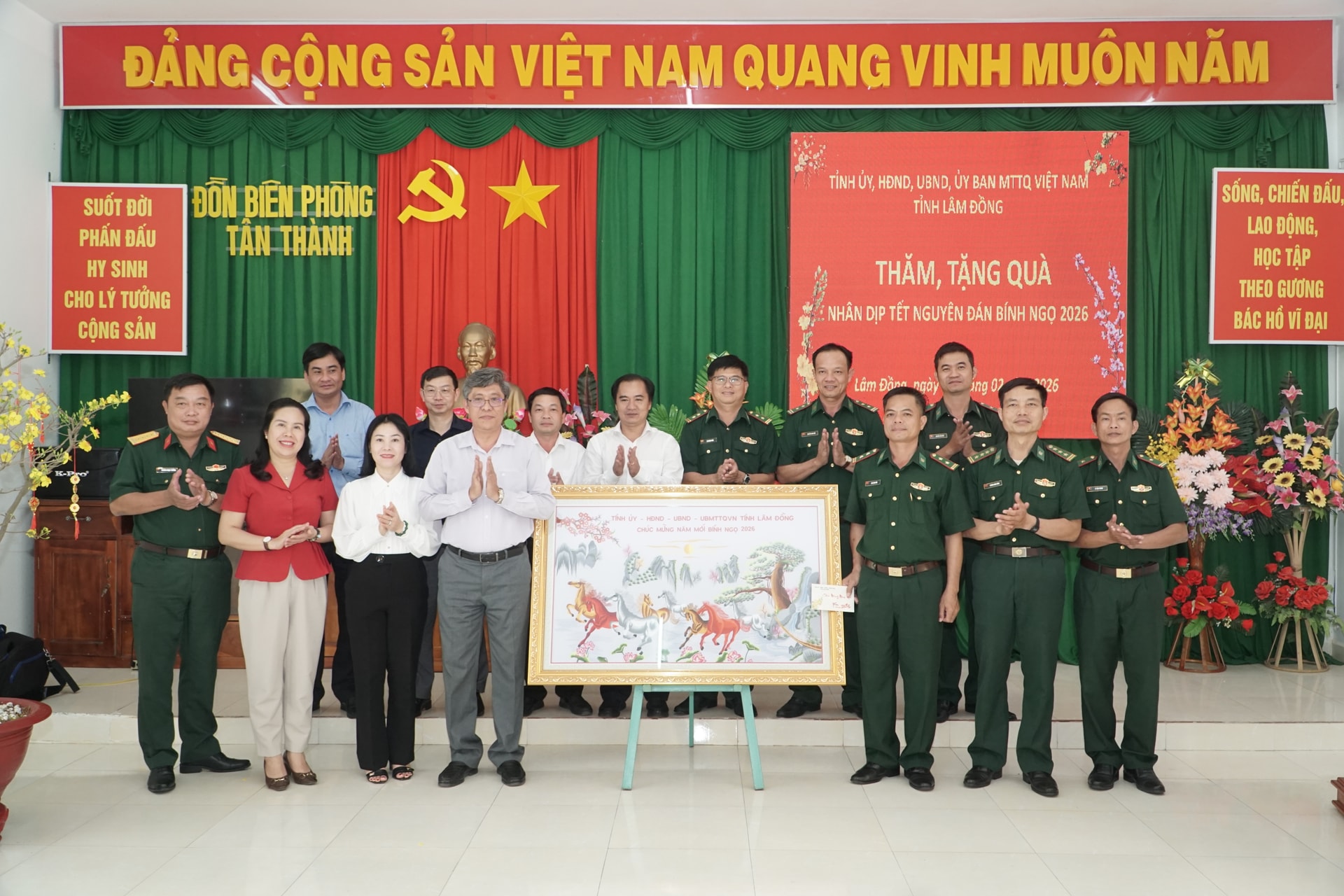 Đoàn công tác của tỉnh Lâm Đồng tặng quà Tết, chụp hình lưu niệm cùng cán bộ, chiến sĩ Đồn Biên phòng Tân Thành