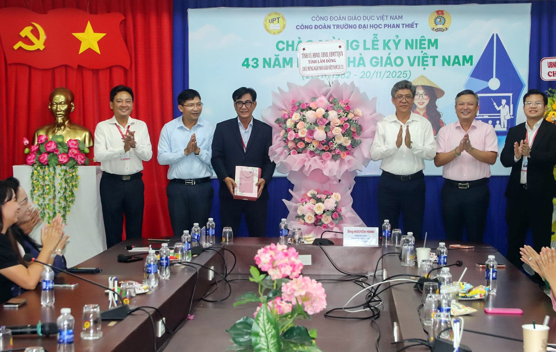 Phó Chủ tịch UBND tỉnh Nguyễn Minh cùng đại diện lãnh đạo Sở Giáo dục và Đào tạo chúc mừng cán bộ quản lý và giảng viên Trường Đại học Phan Thiết nhân ngày Nhà giáo Việt Nam