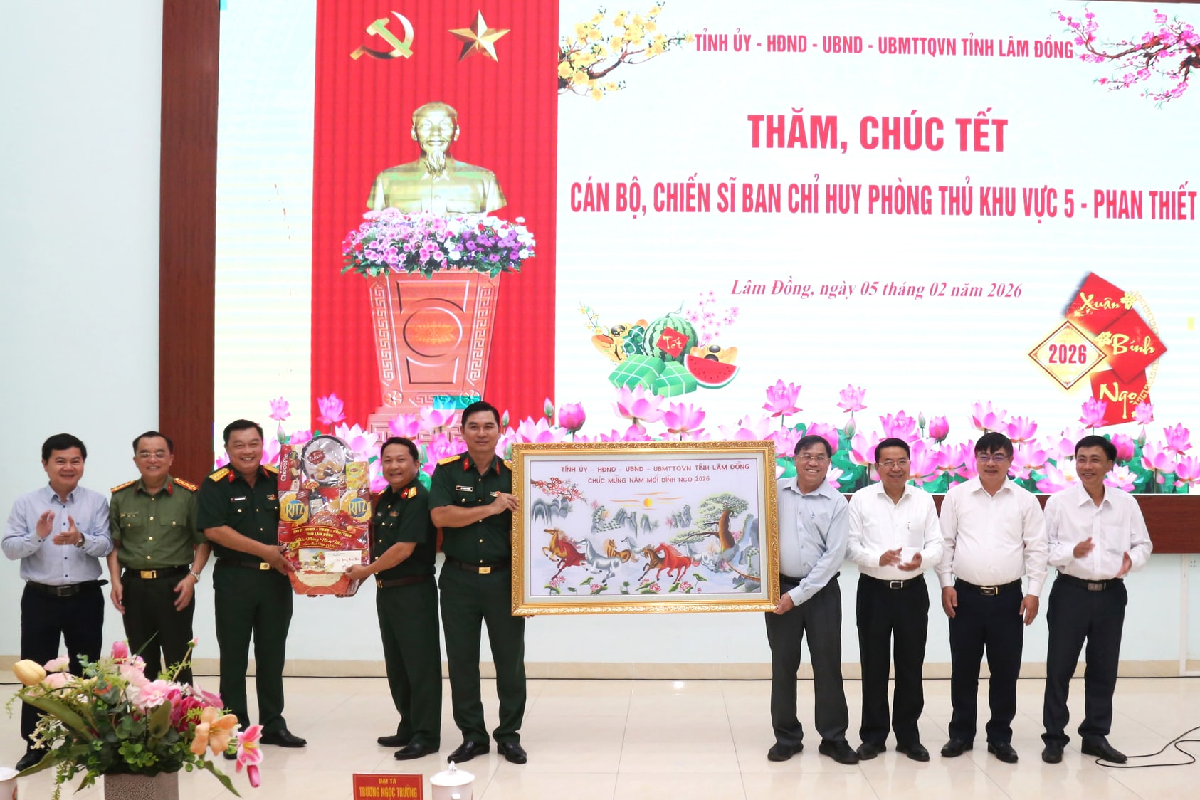 Tại Ban Chỉ huy Phòng thủ Khu vực 5 - Phan Thiết, Đoàn đã được nghe báo cáo về những kết quả nổi bật trong thực hiện nhiệm vụ quân sự, quốc phòng năm 2025 cũng như công tác bảo đảm sẵn sàng chiến đấu, tổ chức lực lượng trực Tết của đơn vị.