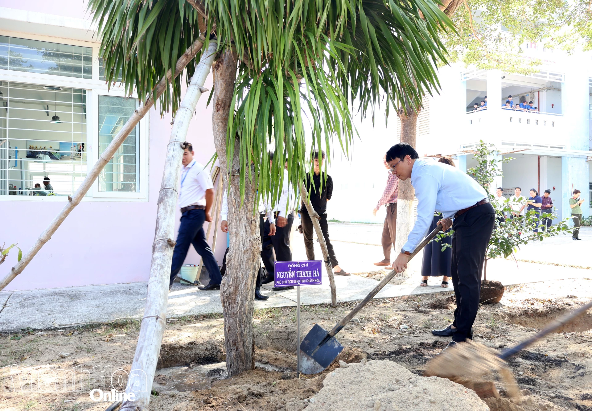 Đồng chí Nguyễn Thanh Hà trồng cây lưu niệm tại trường.