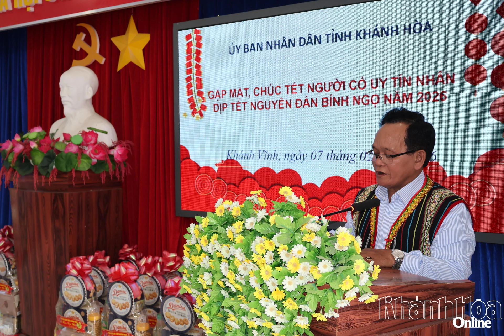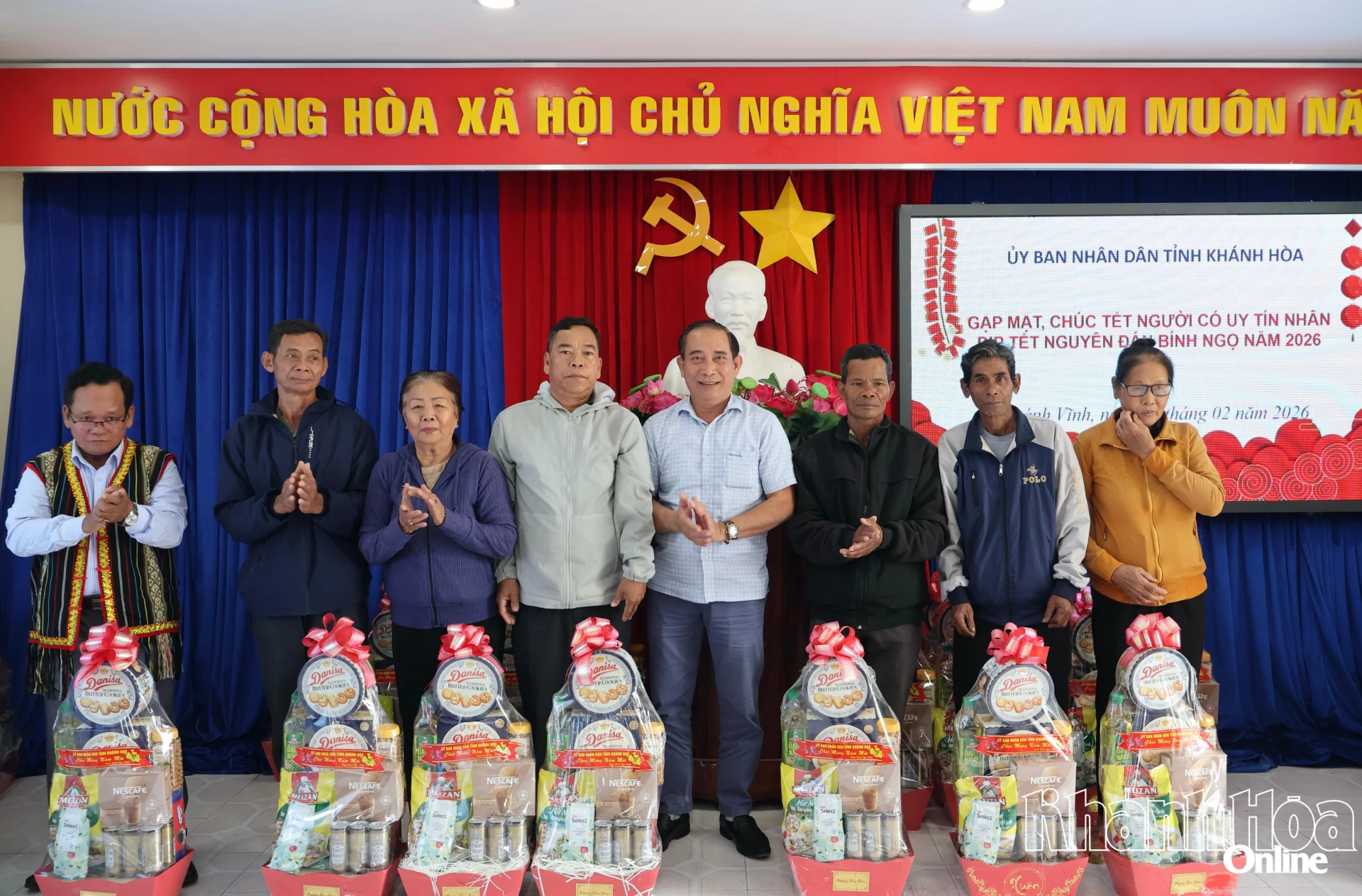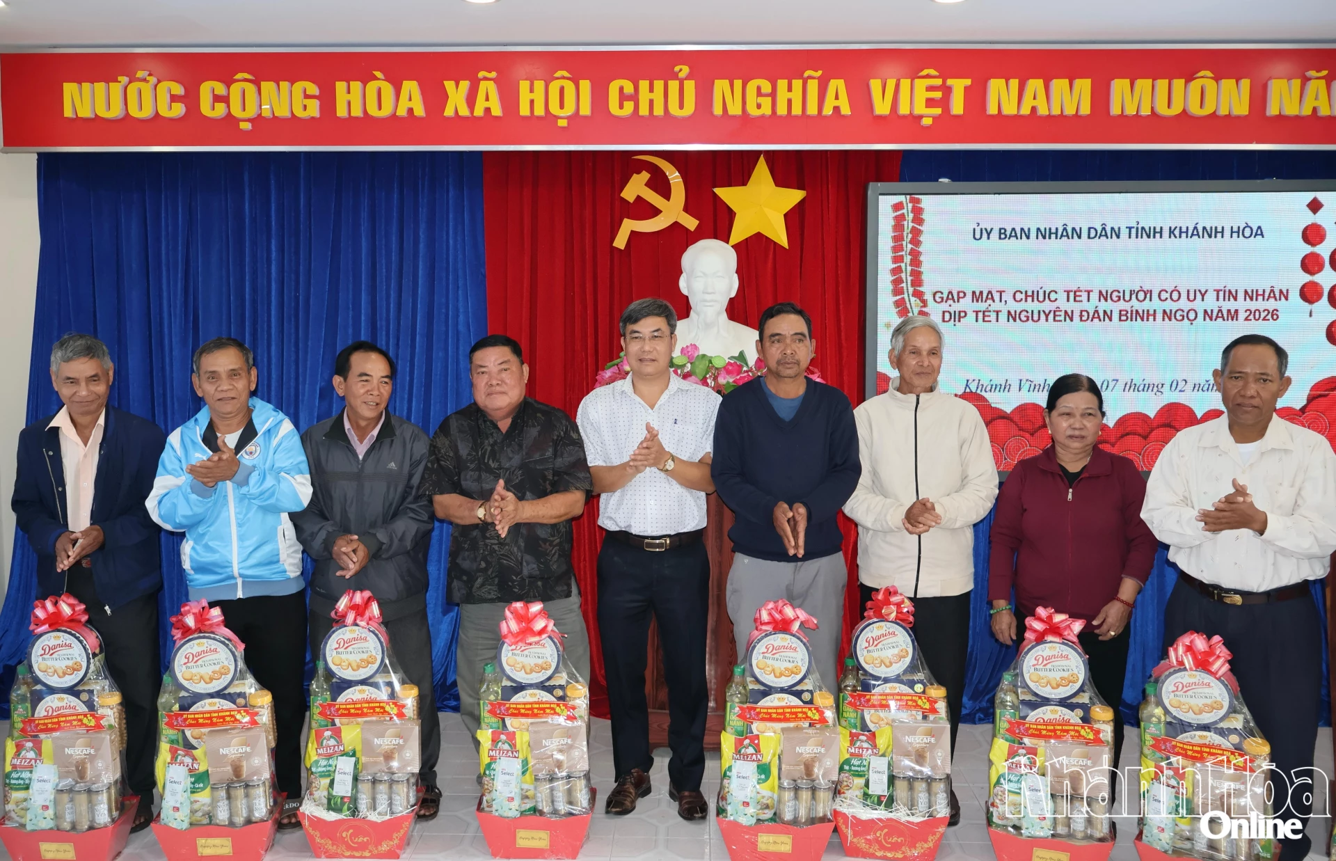 Nhân dịp mừng xuân Bính Ngọ 2026, sáng 7-2, đồng chí Nguyễn Thanh Hà - Phó Chủ tịch UBND tỉnh gặp mặt, chúc Tết và trao 35 suất quà cho 35 người có uy tín của 5 xã: Khánh Vĩnh, Tây Khánh Vĩnh, Nam Khánh Vĩnh, Bắc Khánh Vĩnh, Trung Khánh Vĩnh; mỗi suất quà trị giá 500.000 đồng.