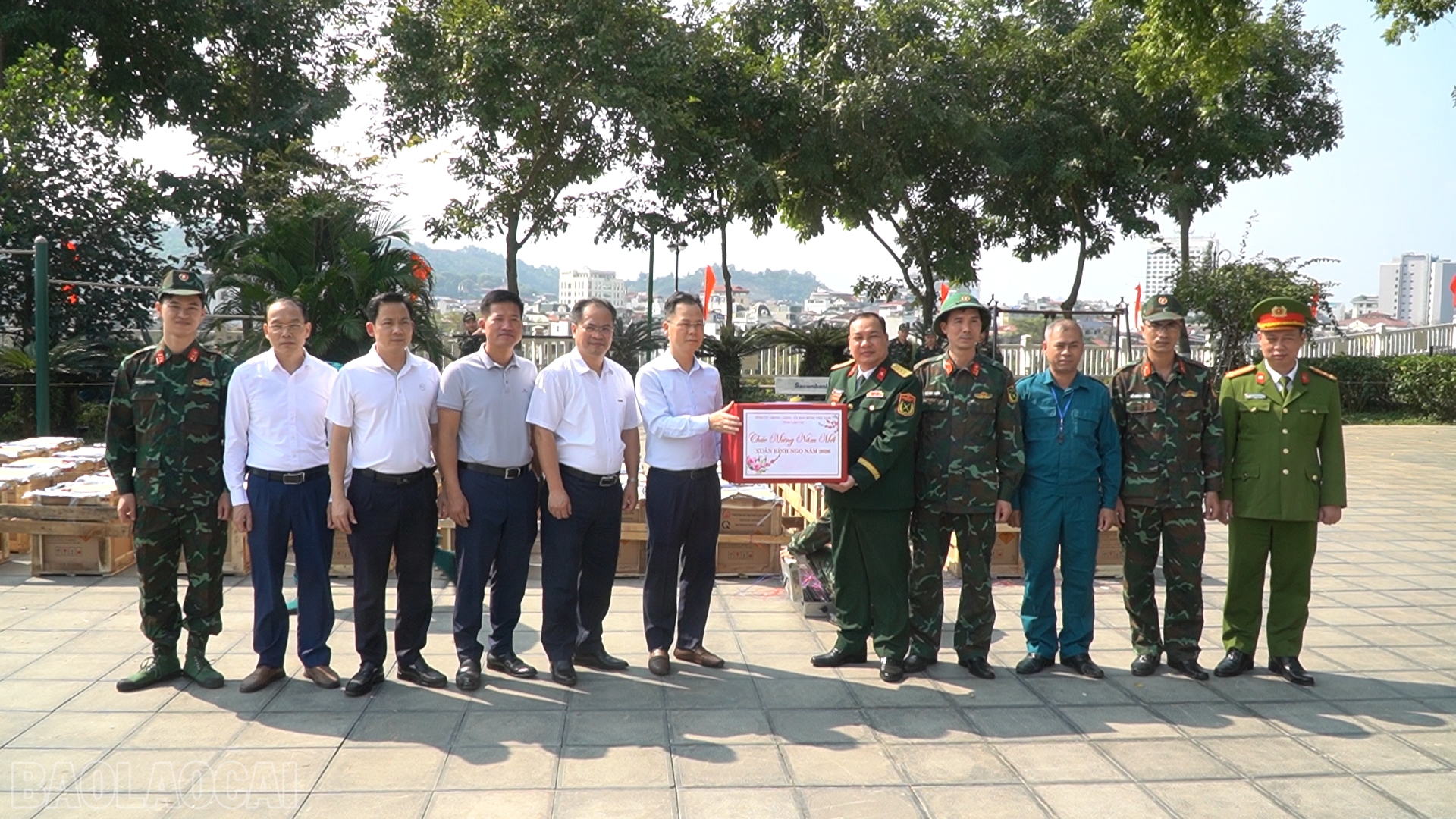 Đồng chí Nguyễn Thành Sinh - Phó Chủ tịch UBND tỉnh và đoàn công tác tặng quà các lực lượng thực hiện nhiệm vụ bắn pháo hoa tại Công viên Hồ Chí Minh, phường Lào Cai.