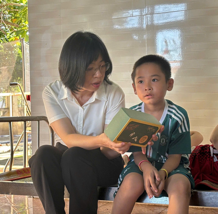 Phó Chủ tịch UBND tỉnh Nguyễn Thị Thanh Lịch trao quà cho thiếu nhi đang điều trị tại Trung tâm Y tế Quy Nhơn. Ảnh: Đoàn Bình