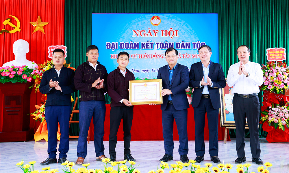 Nhân dịp này, Phó Chủ tịch UBND tỉnh Phan Thế Tuấn trao Bằng khen của Chủ tịch UBND tỉnh cho Ban Công tác Mặt trận, khu dân cư thôn Đồng Dau, xã Tân Sơn đã có thành tích xuất sắc trong thực hiện Cuộc vận động “Toàn dân đoàn kết xây dựng nông thôn mới, đô thị văn minh” năm 2024 - 2025.