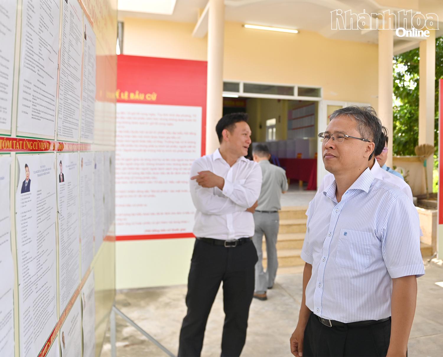 Đồng chí Trần Hòa Nam kiểm tra bảng niêm yết danh sách các ứng cử viên tại một khu vực bỏ phiếu ở xã Vạn Thắng.