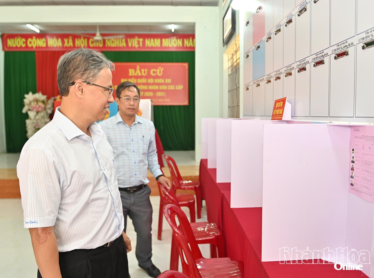 Đồng chí Trần Hòa Nam kiểm tra nơi viết phiếu bầu cử tại một khu vực bỏ phiếu ở xã Vạn Hưng.