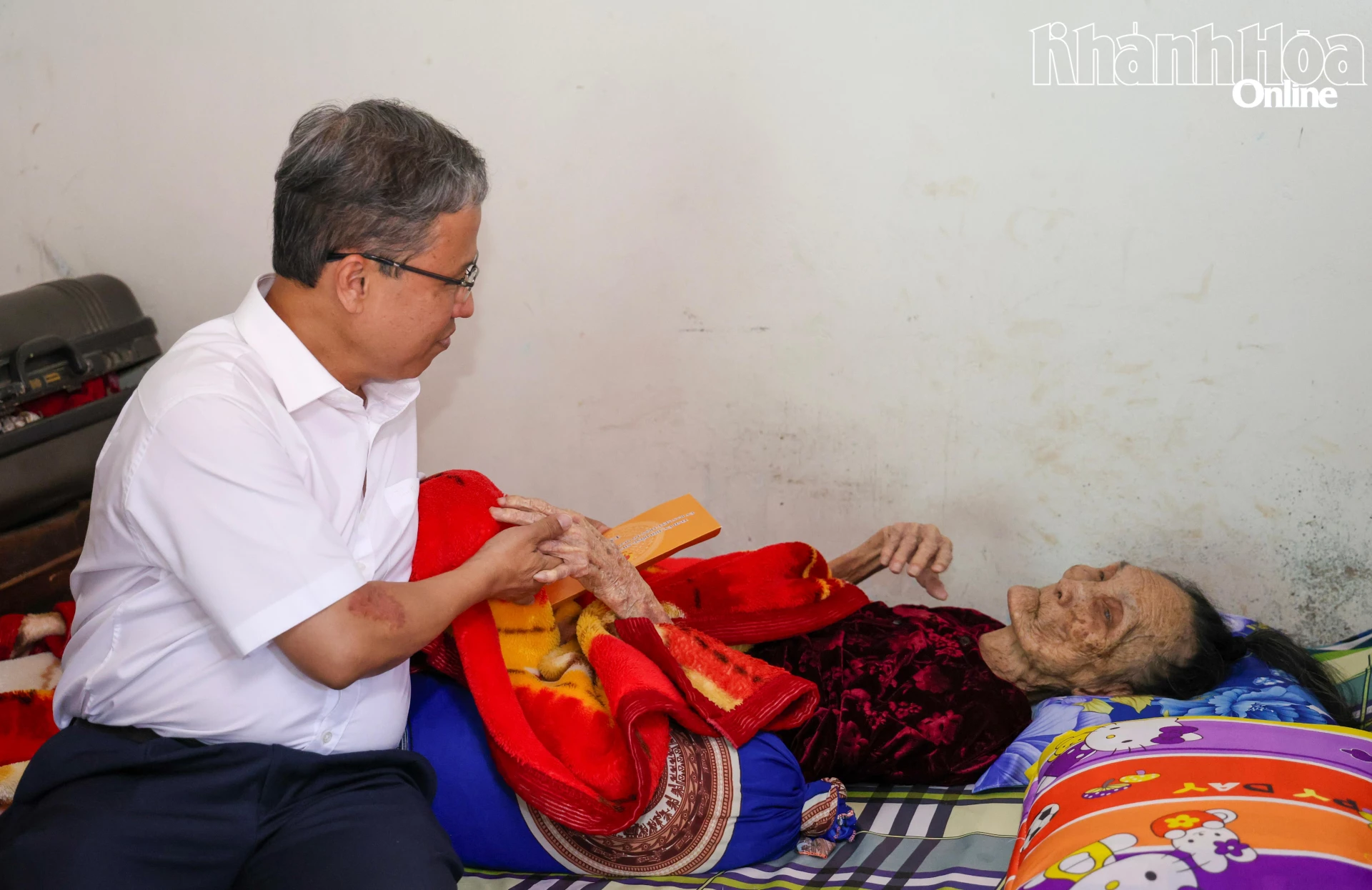 Phó Chủ tịch UBND tỉnh Trần Hòa Nam và các thành viên đoàn công tác thăm hỏi Mẹ Việt Nam anh hùng Cao Thị Mau.