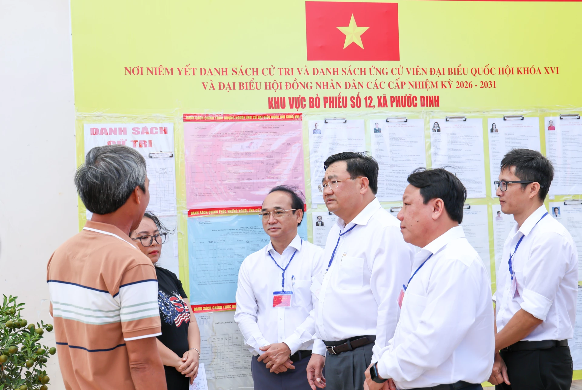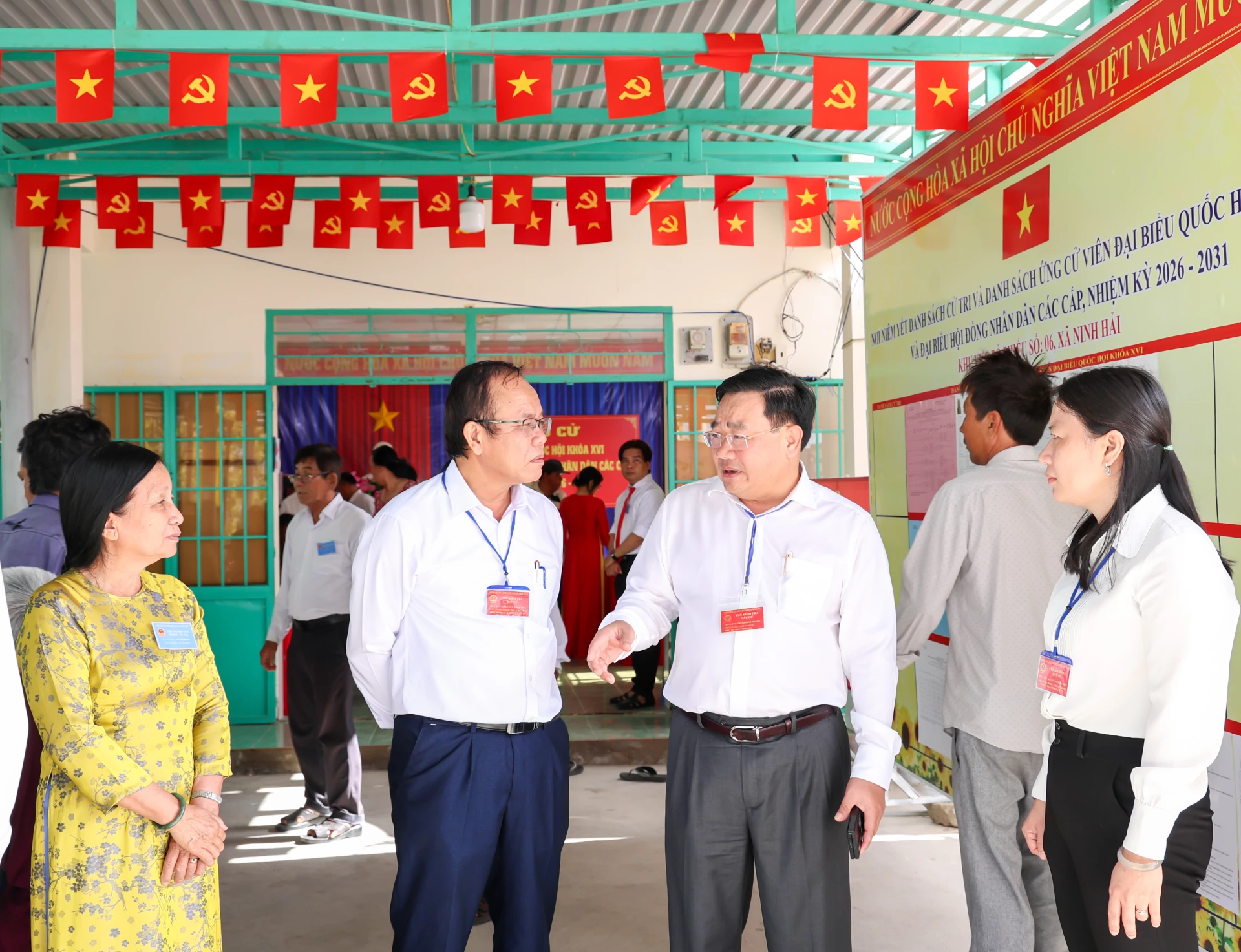 Đồng chí Trịnh Minh Hoàng trao đổi với thành viên Tổ bầu cử thôn Phương Cựu 1, xã Ninh Hải.
