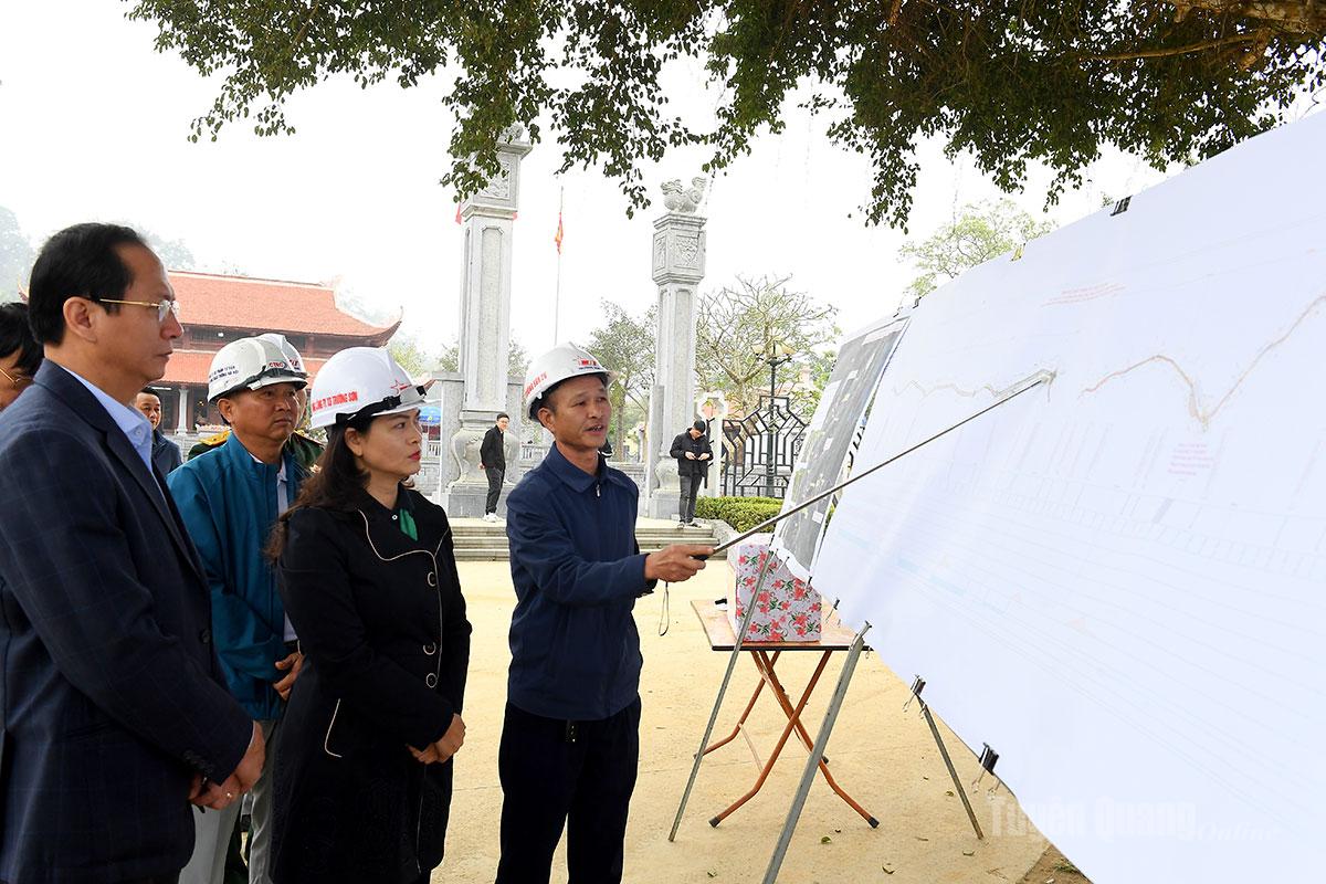 Phó Chủ tịch UBND tỉnh Vương Ngọc Hà nghe đơn vị thi công báo cáo tiến độ thực hiện Dự án cải tạo, nâng cấp tuyến đường cách mạng từ xã Tân Trào đến xã Trung Yên (nay là xã Tân Trào).