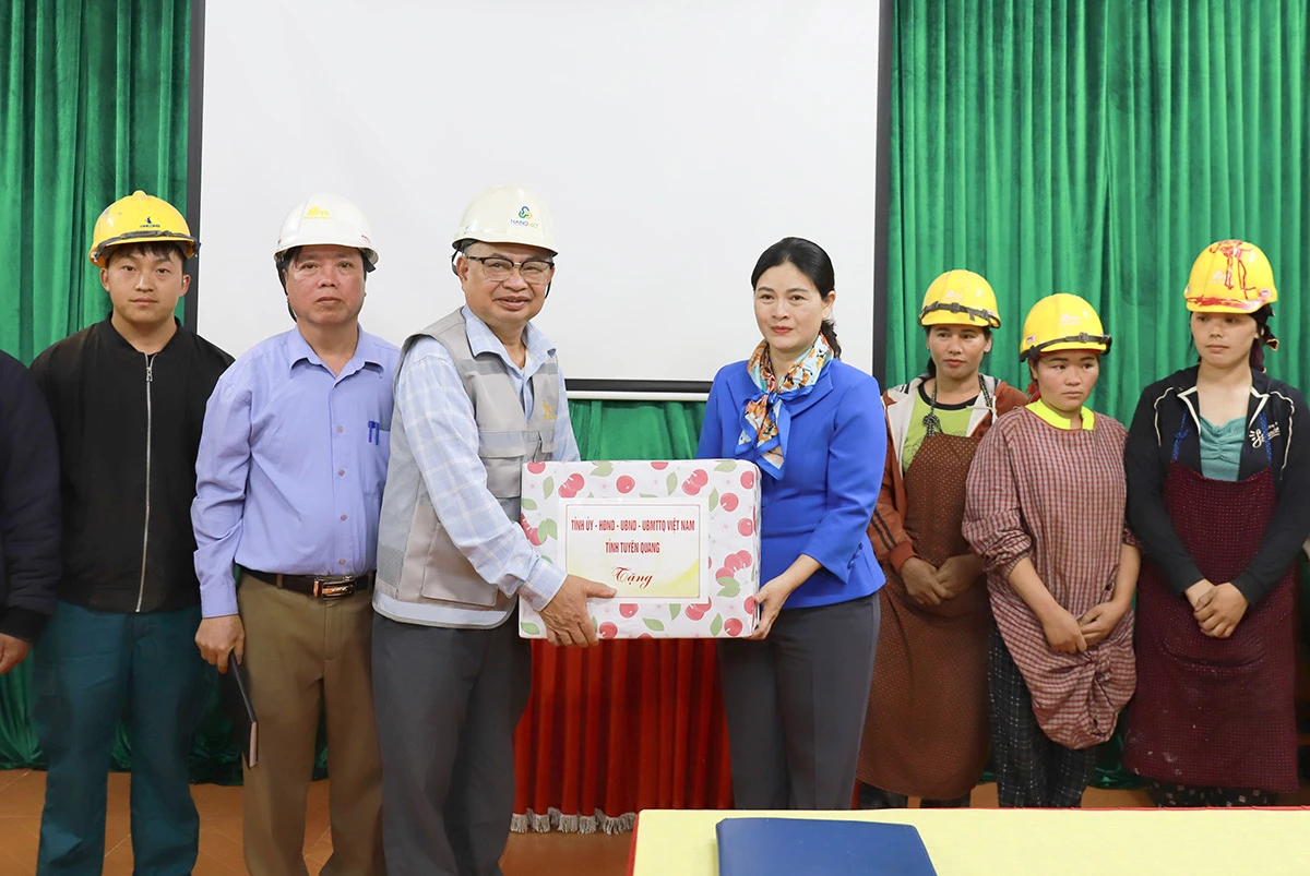 Đồng chí Vương Ngọc Hà, Phó Chủ tịch UBND tỉnh tặng quà động viên công nhân thi công công trình.