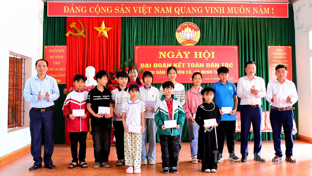 Đại diện thôn Cả và các đại biểu dự Ngày hội tặng quà cho các em học sinh trong thôn có thành tích xuất sắc trong học tập.