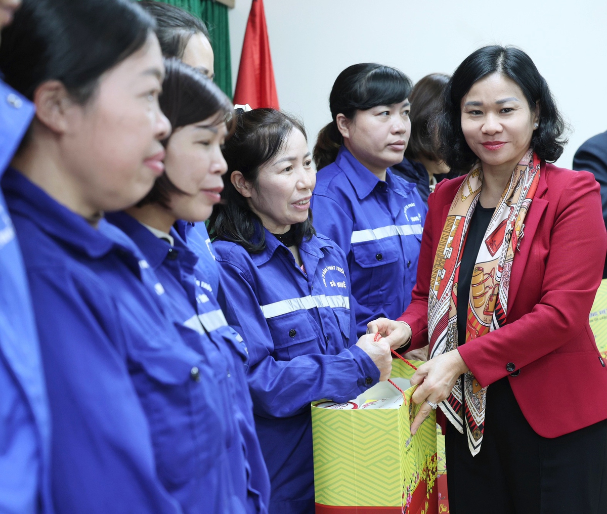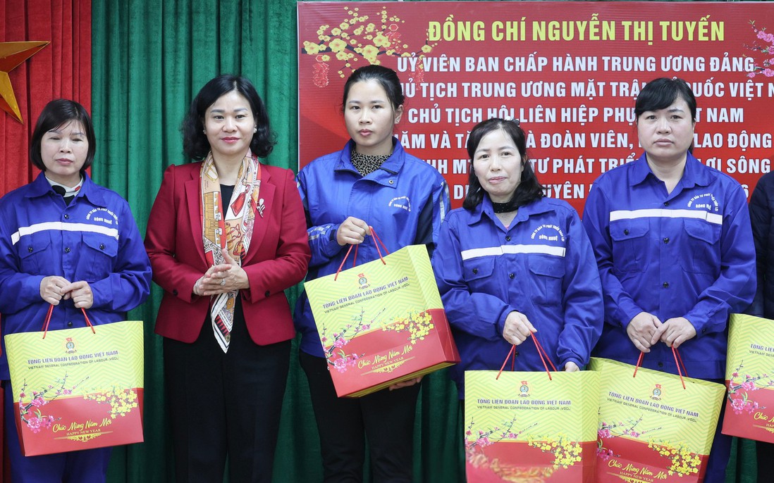 Bà Nguyễn Thị Tuyến (bìa phải), Ủy viên TƯ Đảng, Phó Chủ tịch Ủy ban Trung ương MTTQ Việt Nam, Chủ tịch Hội LHPN Việt Nam, tặng quà cán bộ, công nhân, người lao động tại Công ty TNHH MTV Đầu tư phát triển Thủy lợi Sông Nhuệ (Hà Nội)