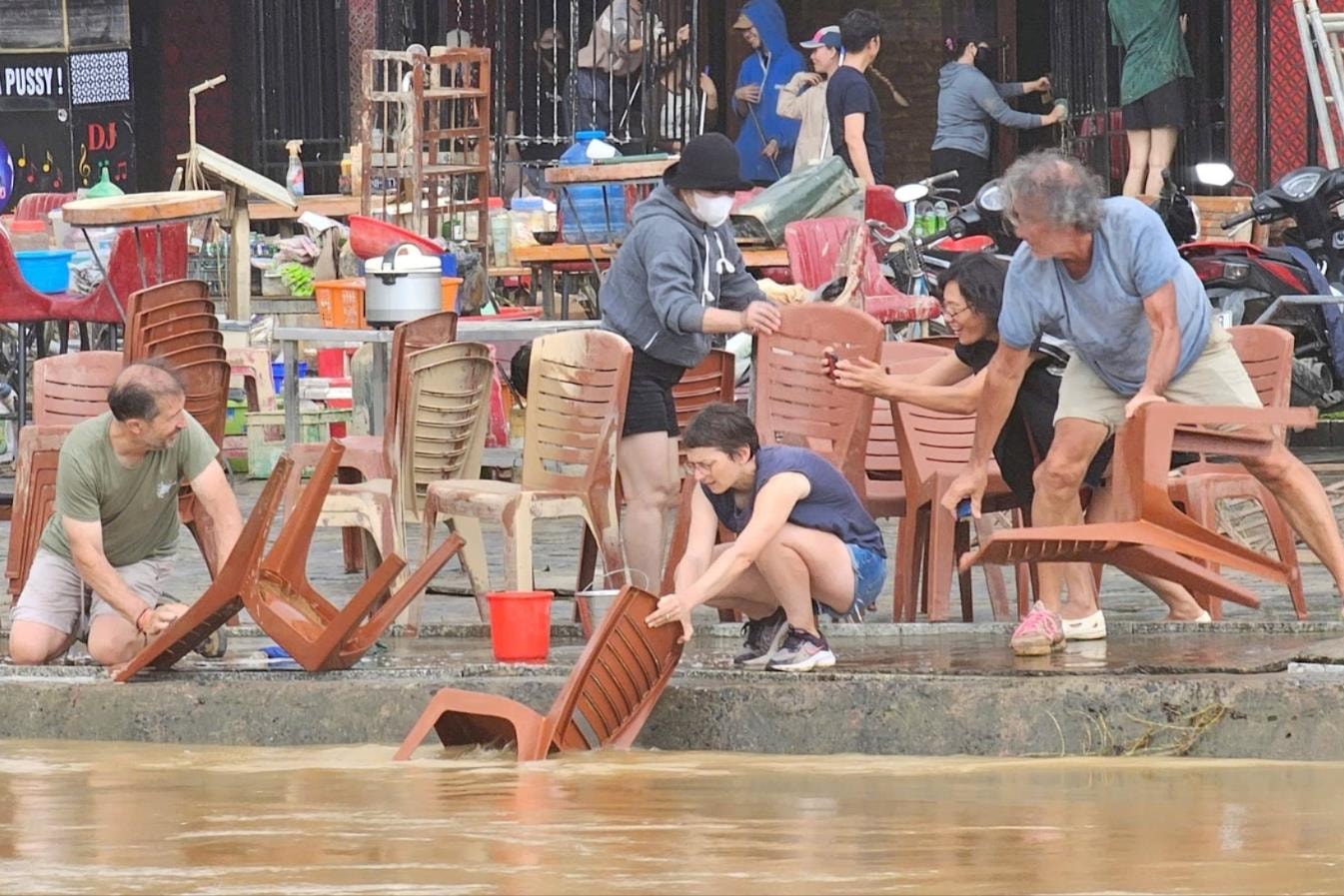 Chủ quán và du khách cùng rửa dọn bàn ghế sau lũ bên bờ sông Hoài.