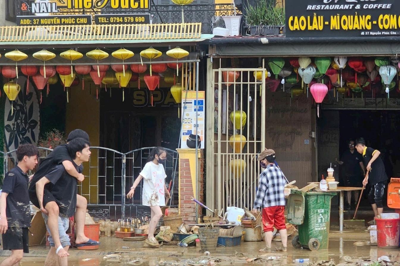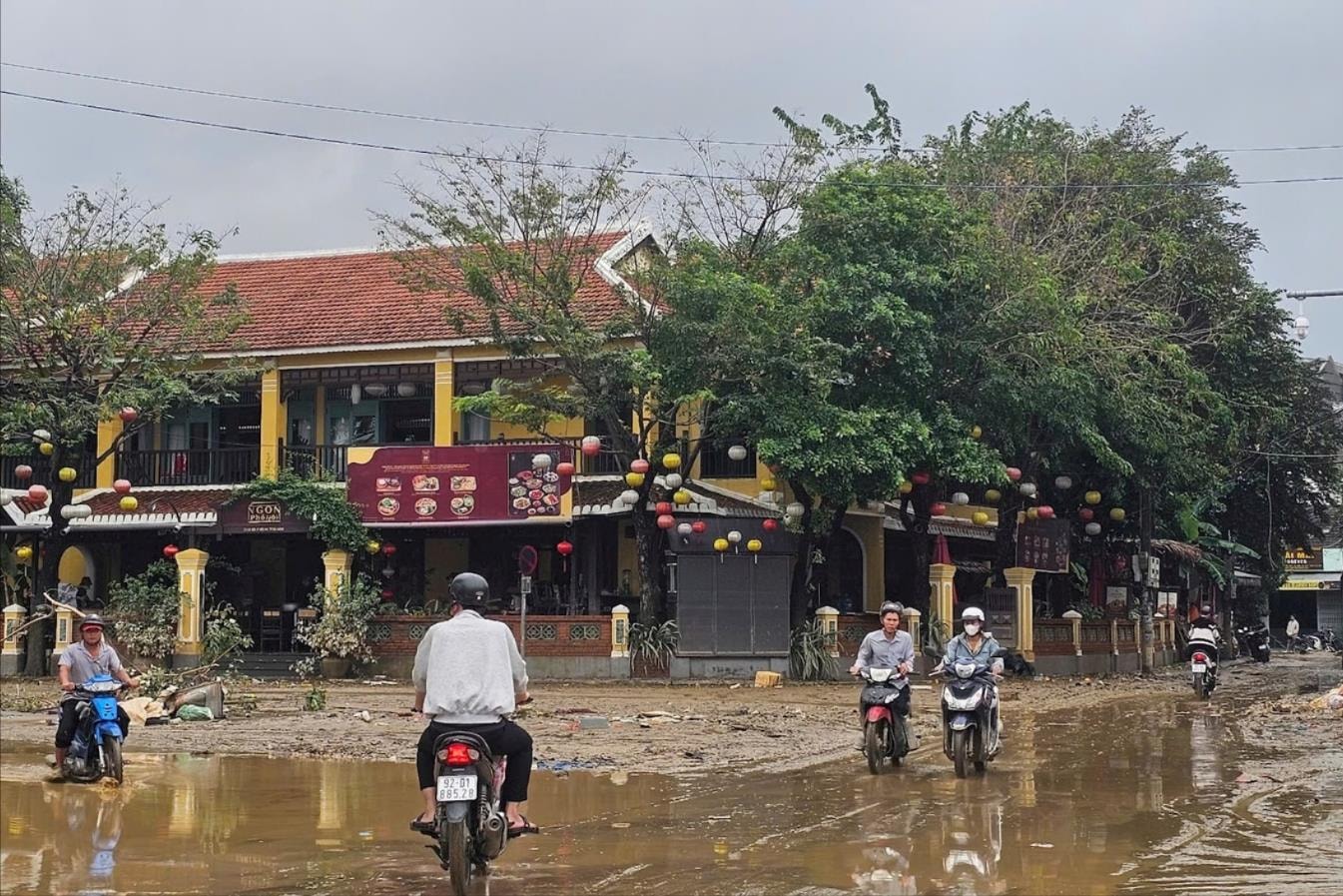 Người dân di chuyển qua tuyến phố ngập bùn sau lũ ở trung tâm Hội An.