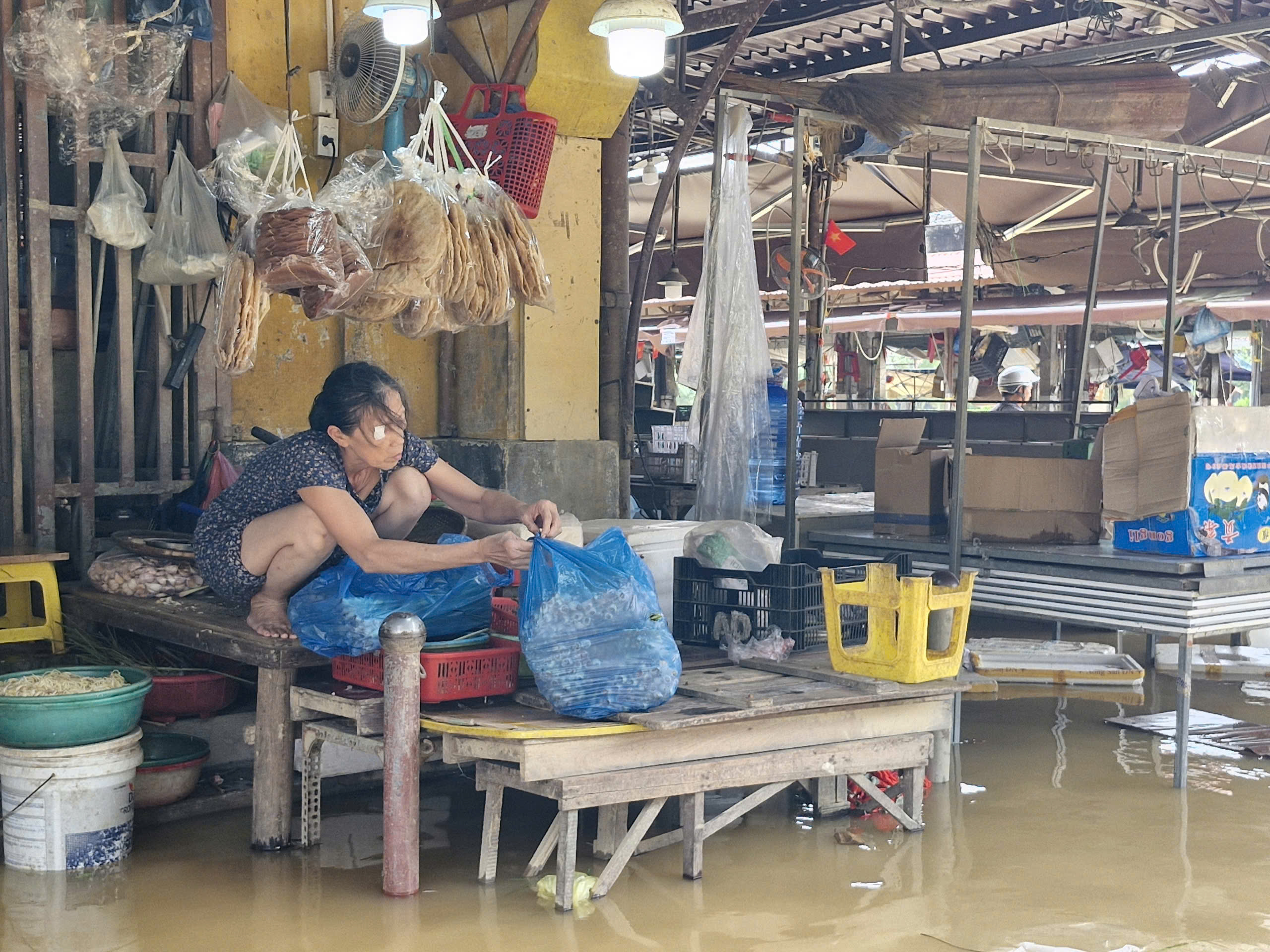 Ghi nhận tại hiện trường, nước ngập đến đầu gối tại một số đoạn đường thấp, khiến nhiều hộ kinh doanh phải khẩn trương kê cao đồ đạc, di chuyển hàng hóa lên nơi an toàn. Một số tiểu thương cho biết, sáng cùng ngày nước chỉ mấp mé hiên nhà, nhưng đến trưa đã dâng nhanh, buộc họ phải ứng phó gấp.