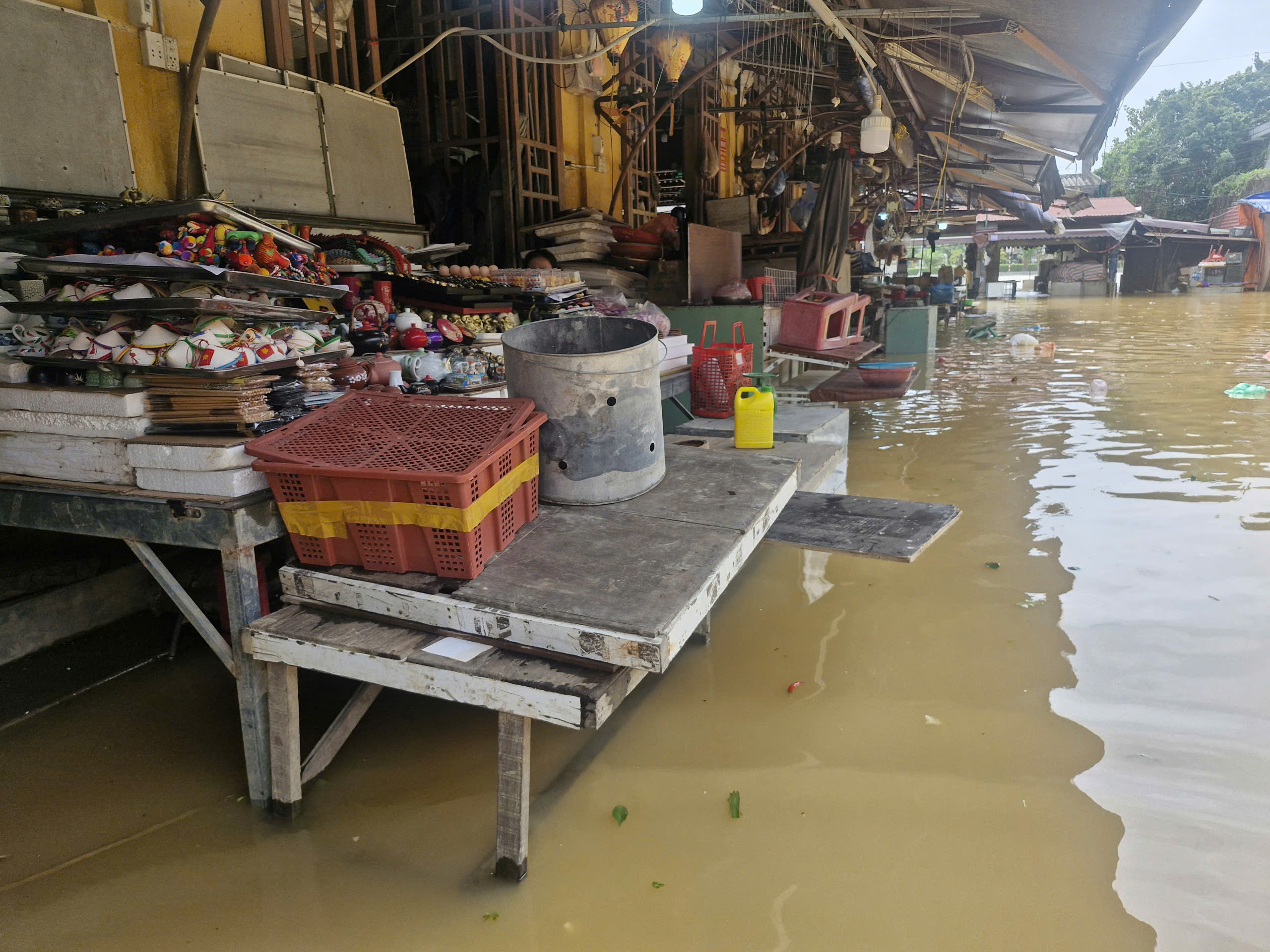 Một số sạp hàng chợ Hội An đã được kê cao để tránh lụt. Ảnh: XUÂN QUỲNH