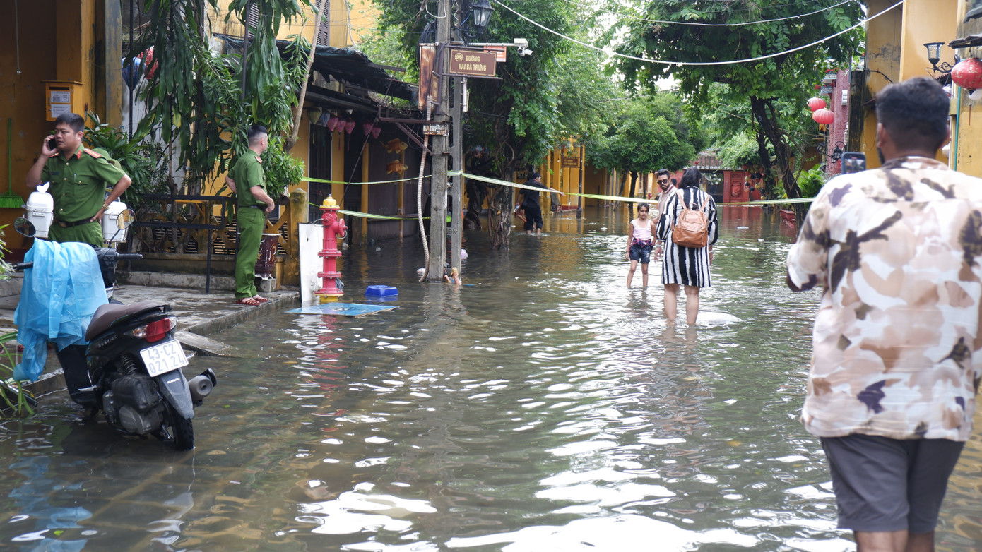 Lực lượng Công an chốt chặn tại khu vực Trần Phú - Châu Thượng Văn gần Chùa Cầu để nhắc nhở du khách không đi vào khu vực nguy hiểm, nước chảy xiết. Chính quyền TP Hội An cho biết, mực nước sông Hoài đang ở mức báo động 2, có khả năng tiếp tục dâng nếu mưa lớn kéo dài. Lực lượng chức năng túc trực tại các điểm ngập sâu để hỗ trợ người dân và hướng dẫn du khách đảm bảo an toàn.