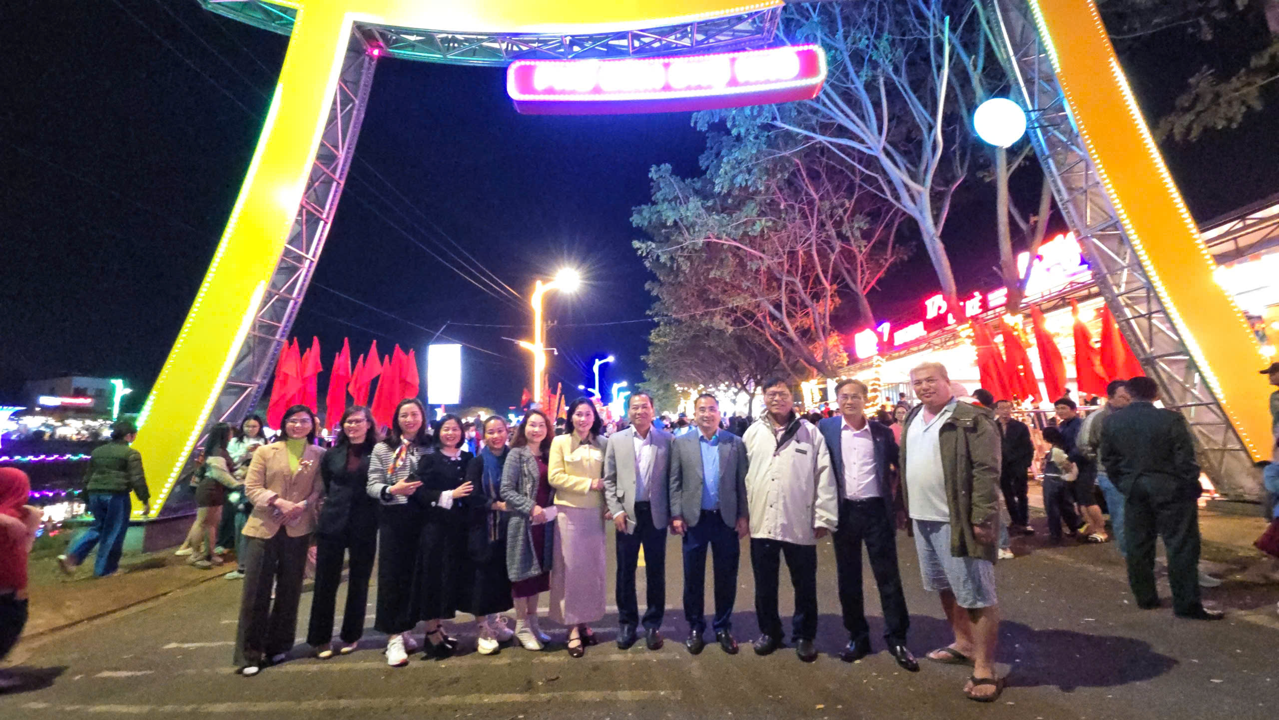 Lãnh đạo phường Pleiku và các du khách chụp ảnh lưu niệm tại đêm khai trương.