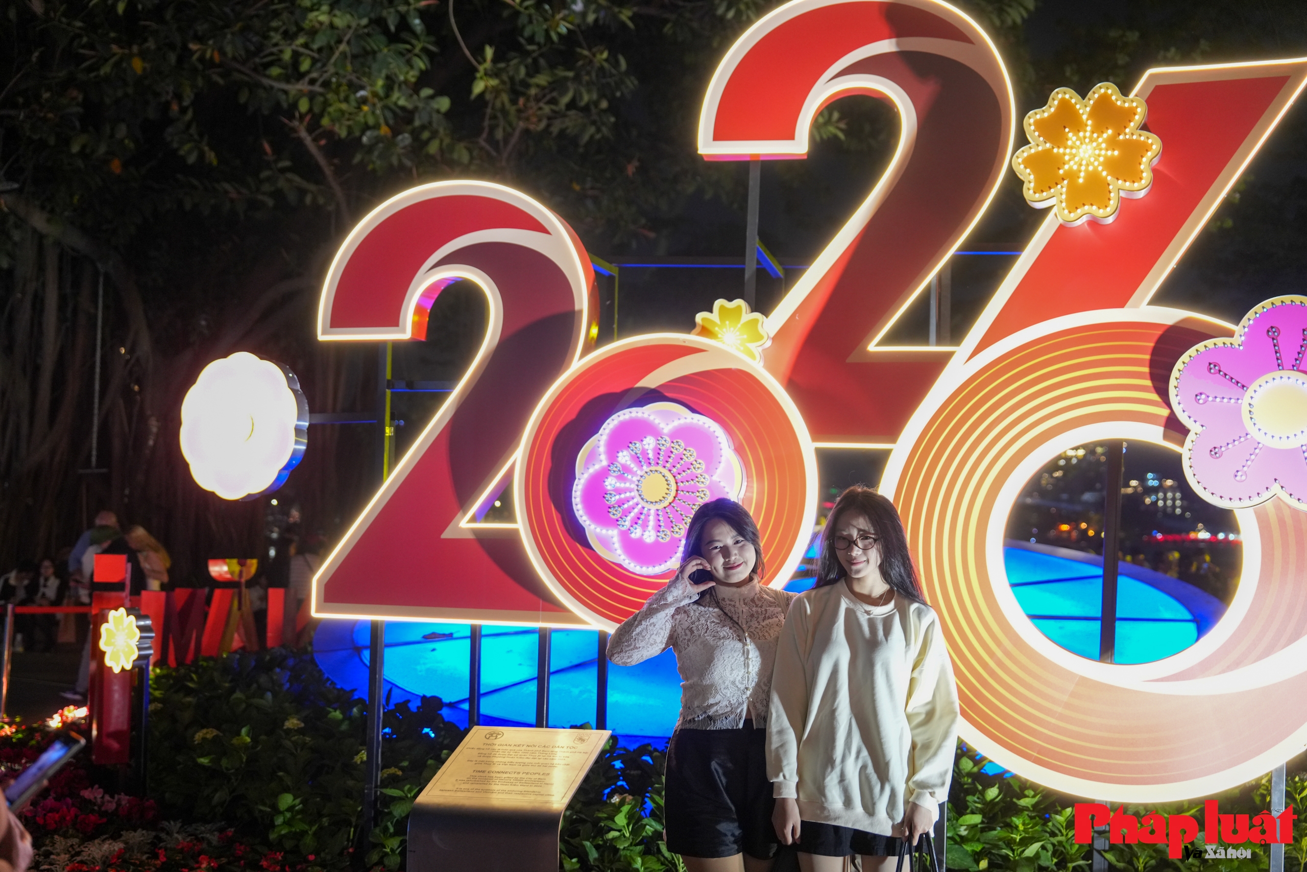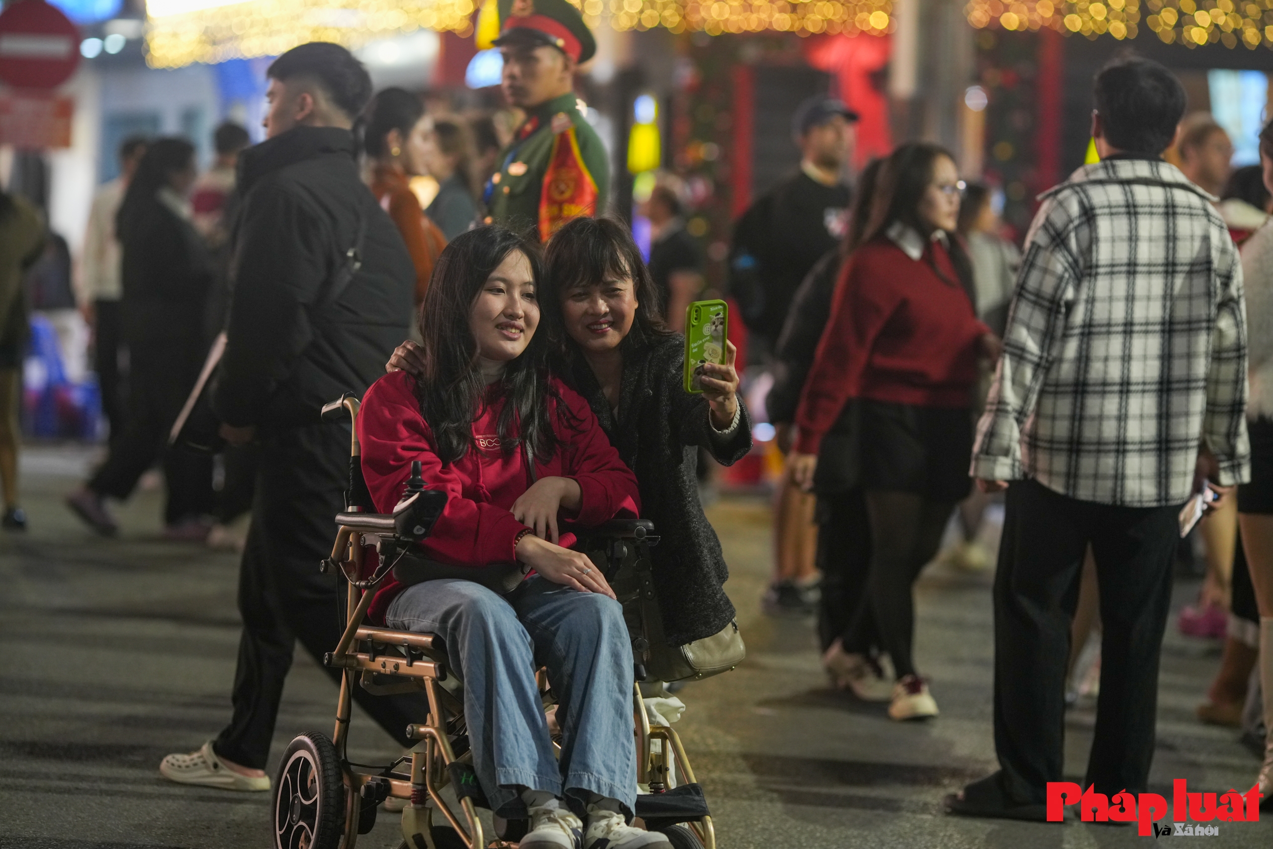 Những nhóm bạn trẻ tạo dáng chụp ảnh tập thể, phía sau là biển người và ánh đèn rực sáng. Các bức ảnh được chụp liên tục, như một cách lưu giữ dấu mốc đặc biệt của năm 2025.