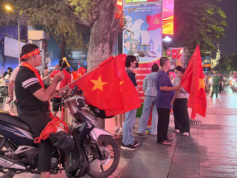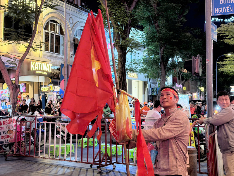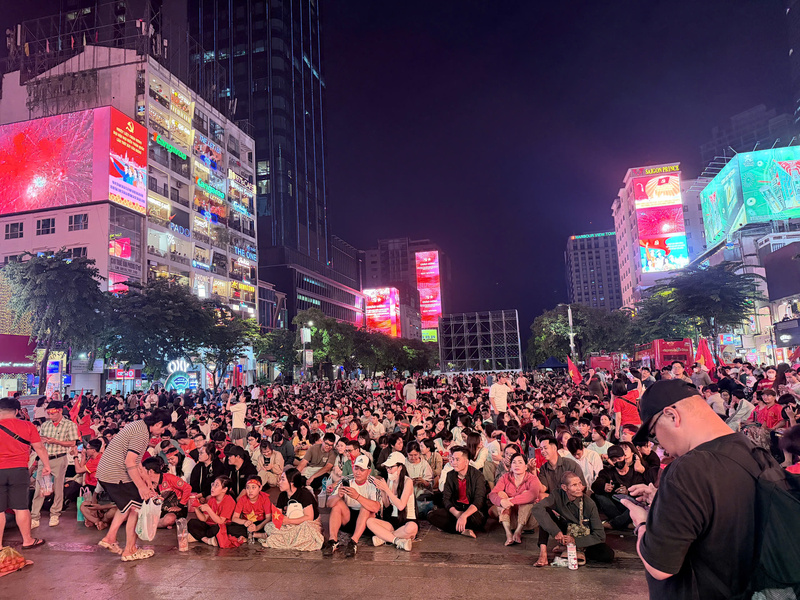 Theo ghi nhận của PV Báo Công Thương, ngay từ khoảng 19h, dòng người đã bắt đầu đổ về phố đi bộ Nguyễn Huệ. Càng về gần giờ bóng lăn, khu vực trung tâm thành phố càng trở nên chật kín. Cả tuyến phố như được nhuộm đỏ bởi cờ Tổ quốc, áo cờ đỏ sao vàng và những vật dụng cổ vũ trên tay người hâm mộ. Hàng nghìn người chen kín các khoảng trống, tất cả cùng hướng ánh mắt về những màn hình LED khổng lồ đang chờ thời khắc khai cuộc.