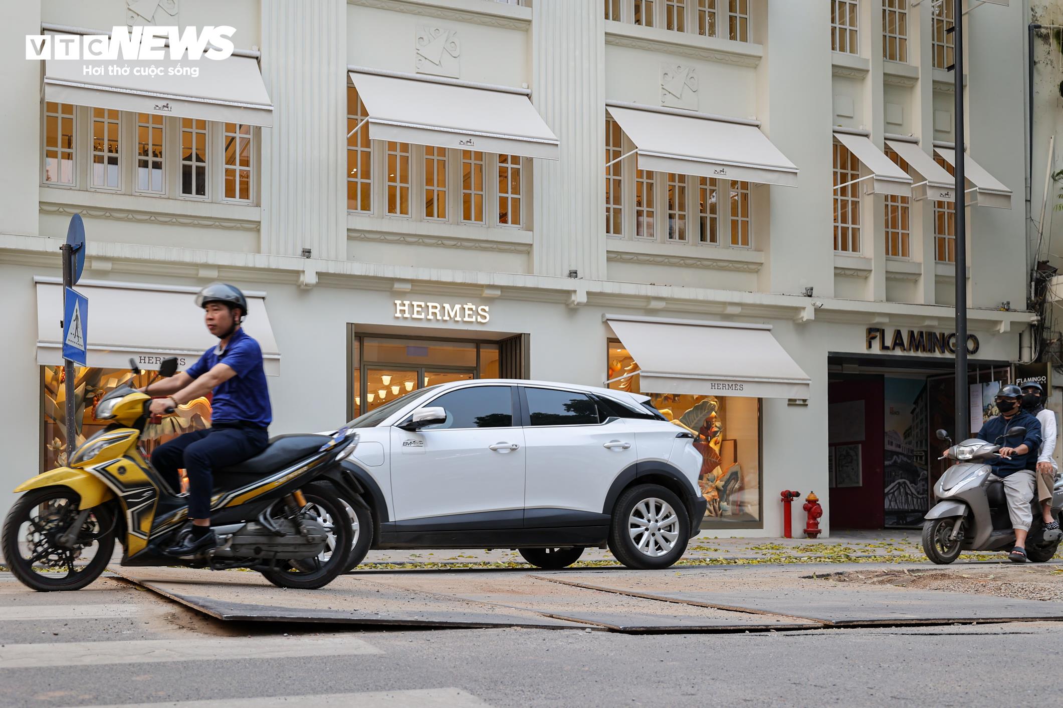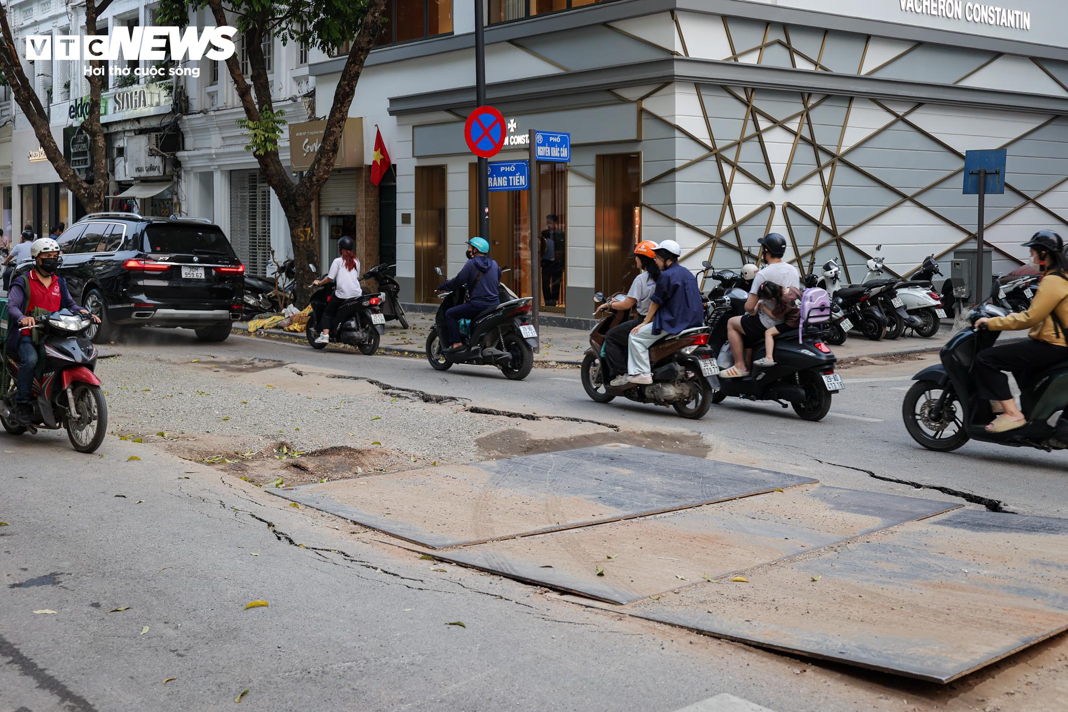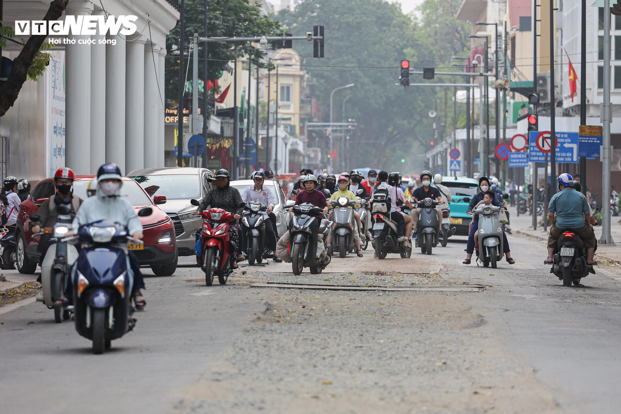 Mặt đường Tràng Tiền hiện bị lật lên toàn bộ phần lõi giữa để phục vụ thi công hạ tầng ngầm. Một rãnh sâu kéo dài dọc theo tuyến phố như một con mương giữa đường.