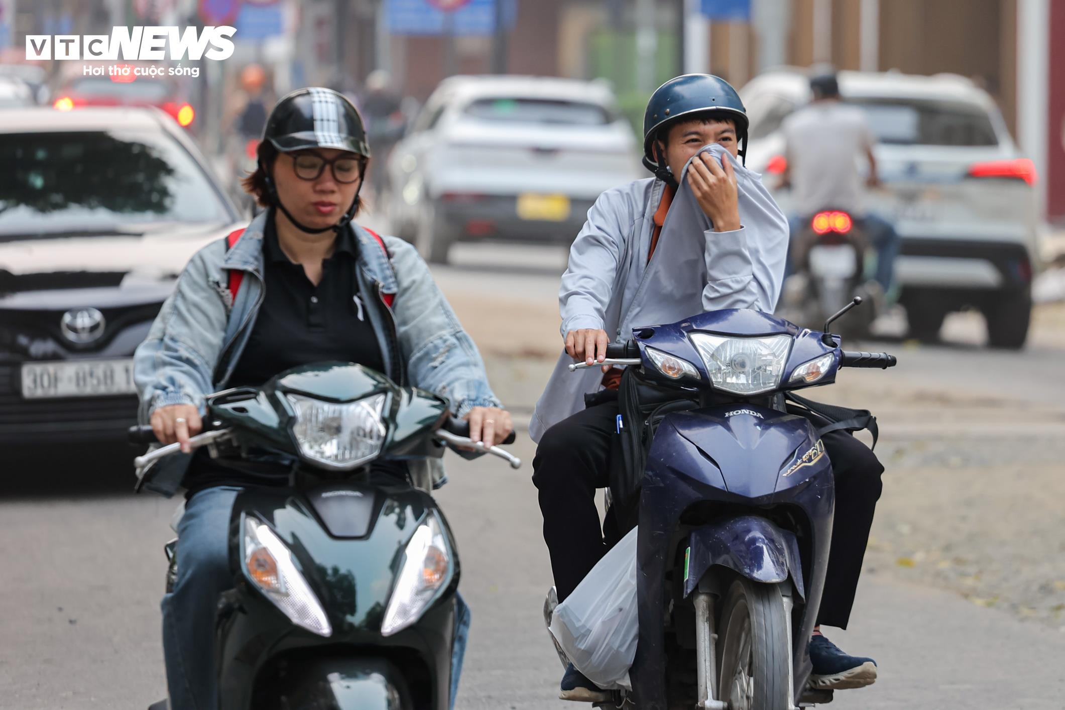 Người đi bộ trên vỉa hè cũng phải dùng tay che mặt để tránh bụi.