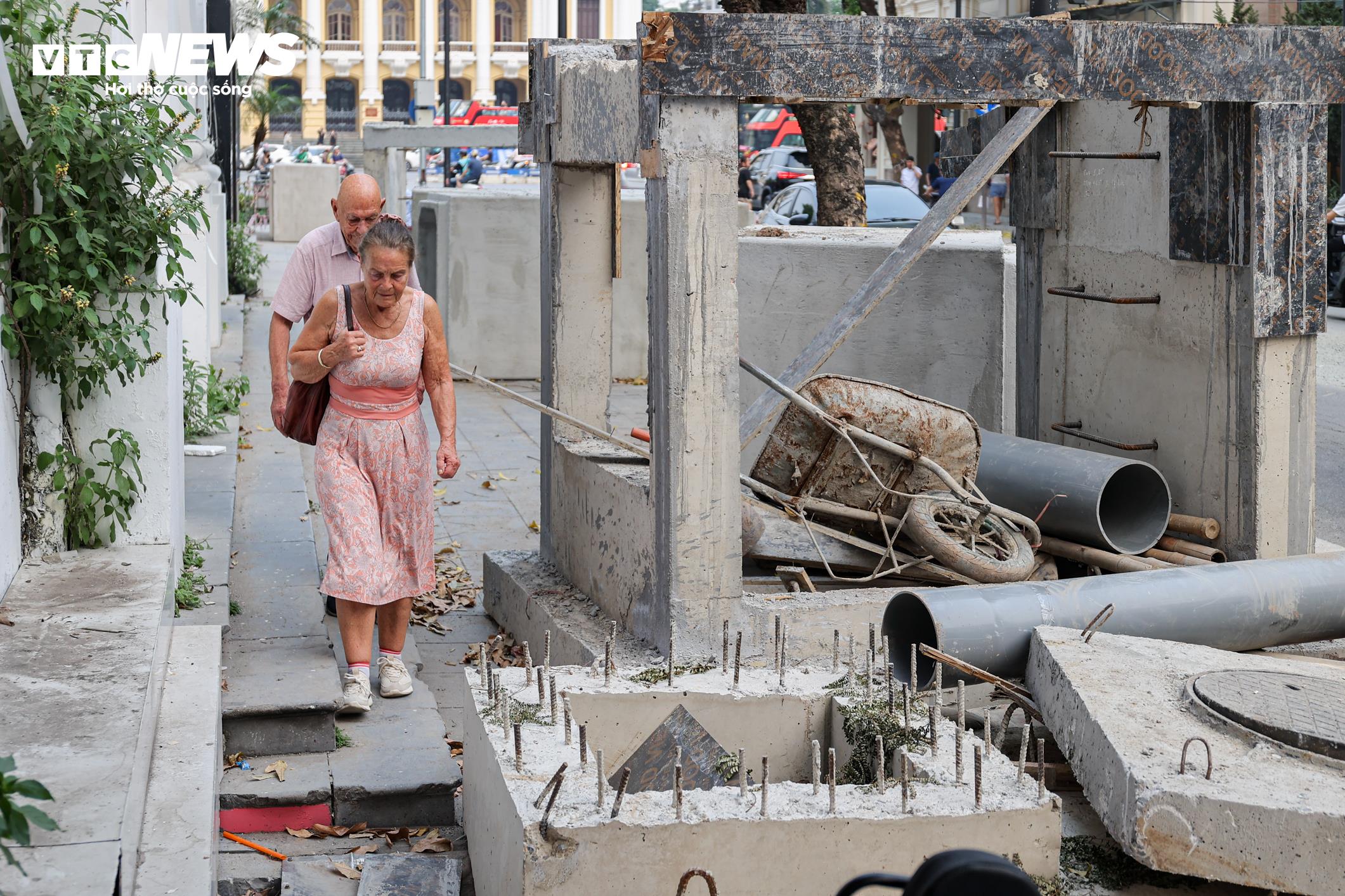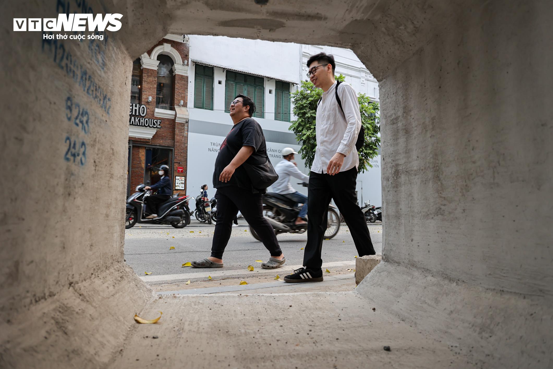 “Các ống cống bê tông chiếm dụng nhiều đoạn vỉa hè trên phố Tràng Tiền, khiến tôi phải đi xuống lòng đường, không chỉ bất tiện mà còn rất nguy hiểm”, nữ du khách nước ngoài chia sẻ.
