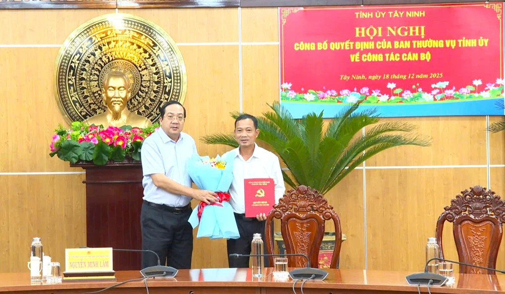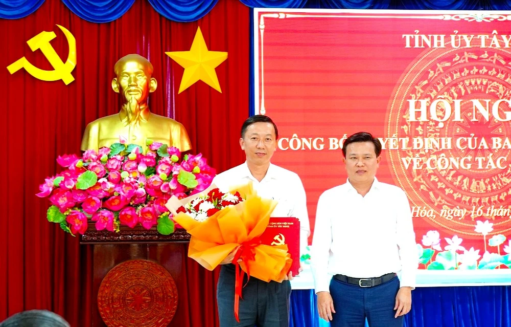 Ông Nguyễn Thanh Hải Phó Bí thư tỉnh ủy Tây Ninh (phải) trao quyết định và tặng hoa cho ông Nguyễn Hoàng Minh. Ảnh: MỘC HÓA