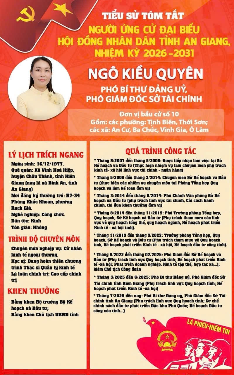 Bà Ngô Kiều Quyên là người ứng cử đại biểu HĐND tỉnh An Giang nhiệm kỳ 2026-2031, thuộc đơn vị bầu cử số 10, tại các Xã: An Cư, Ba Chúc, Ô Lâm, Vĩnh Gia; Phường Tịnh Biên.