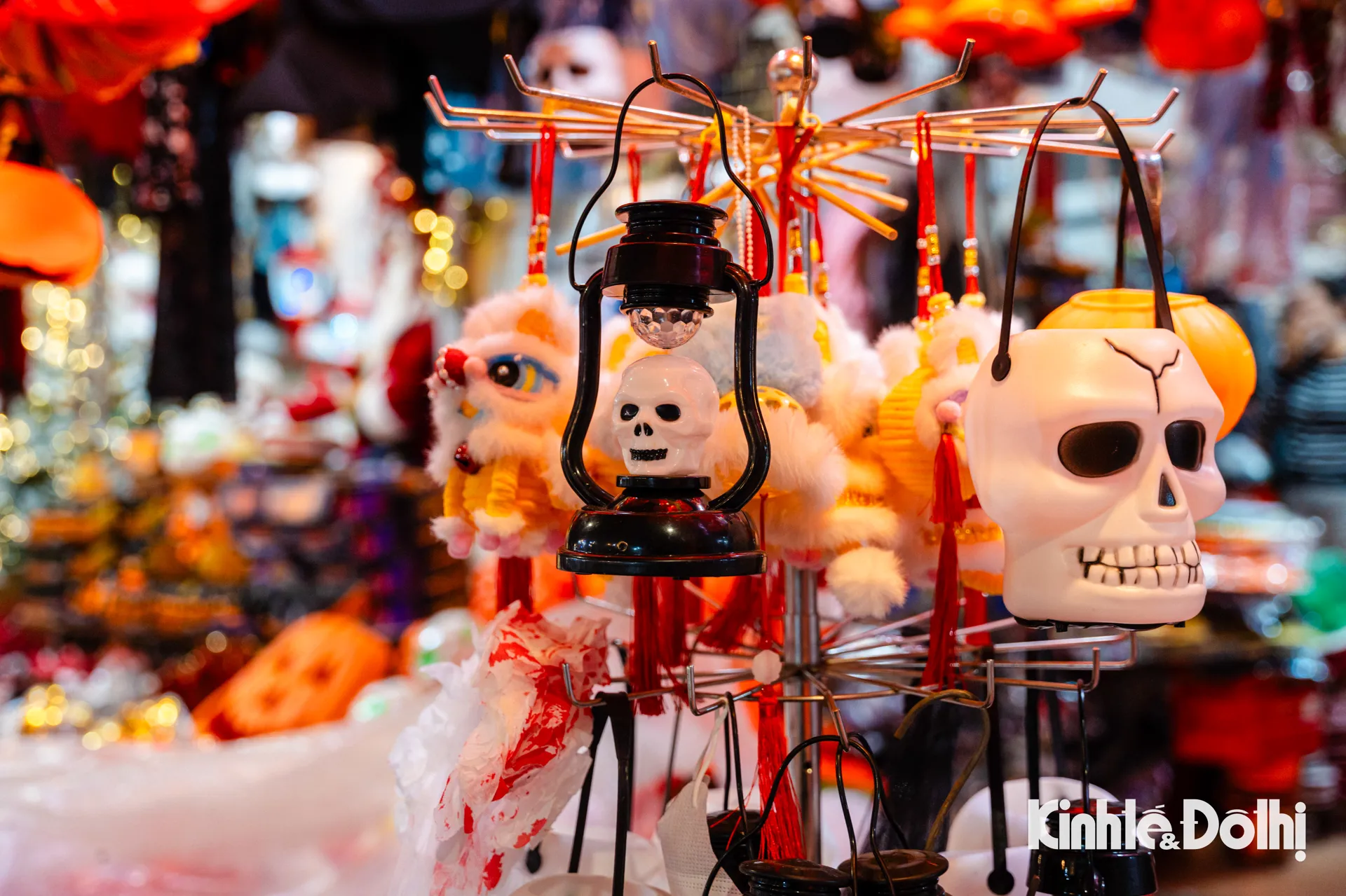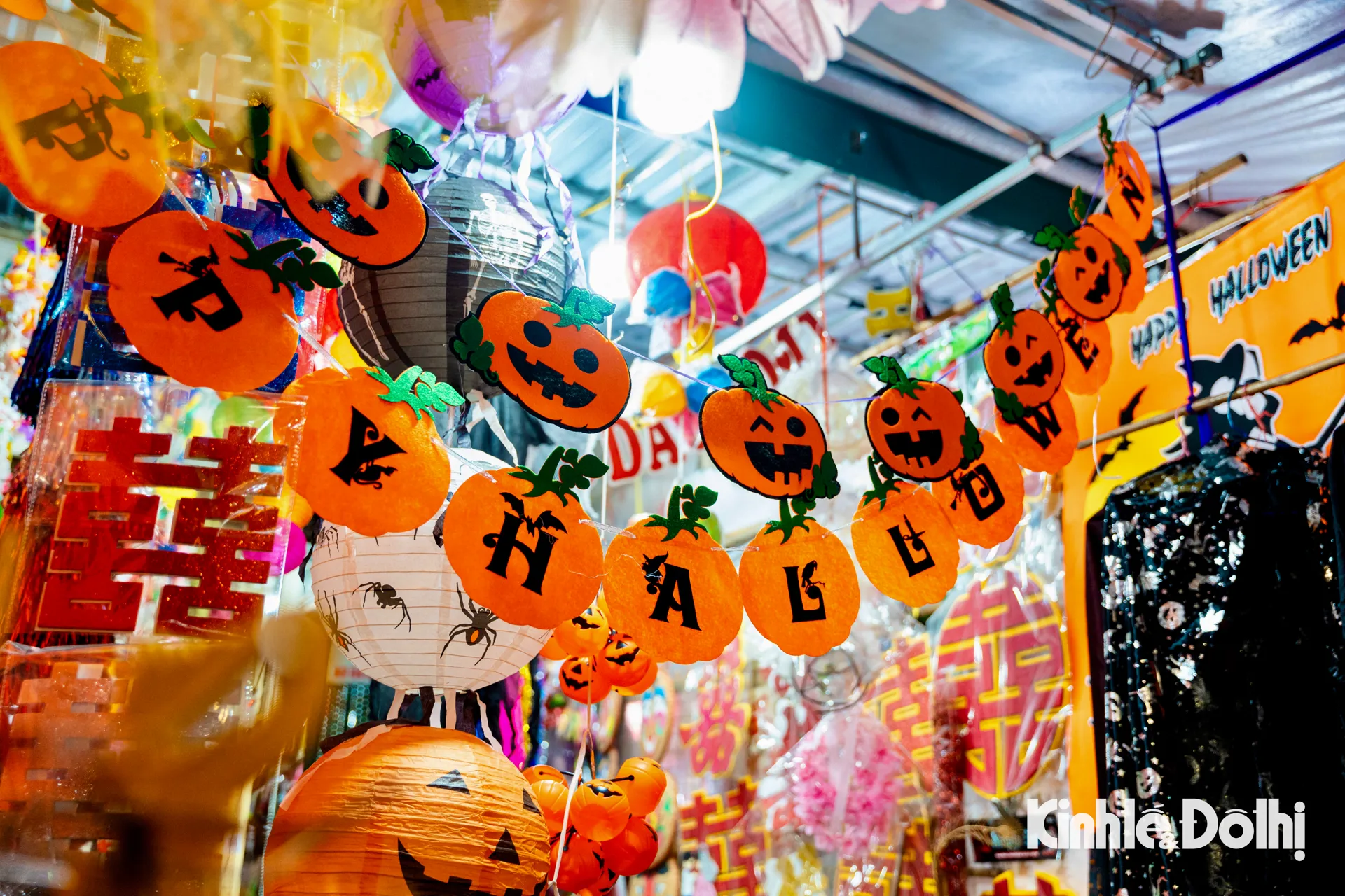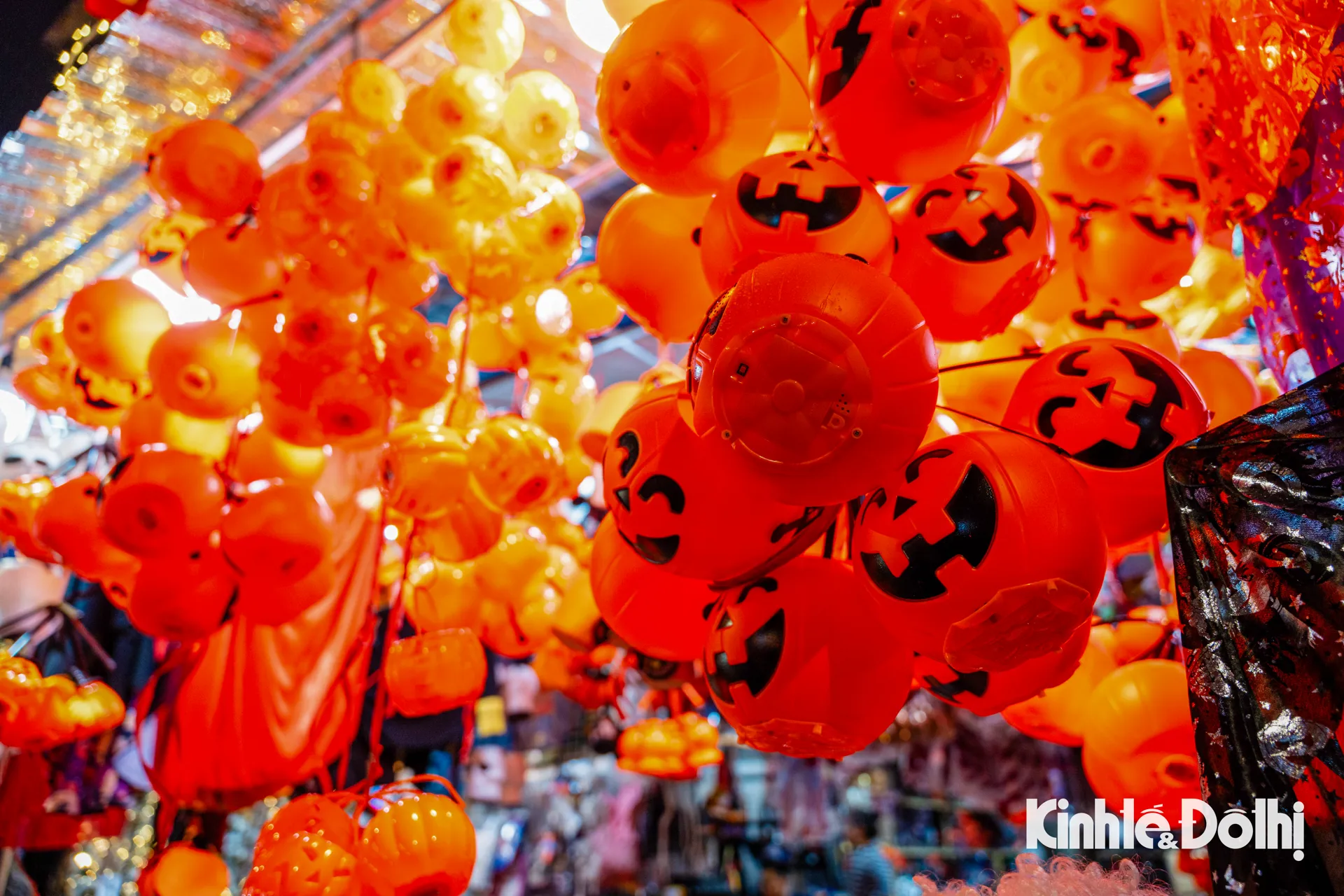 Những chiếc đầu lâu lấp ló dưới ánh đèn, mặt nạ phù thủy treo kín lối đi, bí ngô “quỷ” với đủ hình thù kỳ quái, áo choàng đen, mũ chóp nhọn, và cả những chiếc đèn lồng ma mị nhấp nháy ánh sáng đỏ cam.