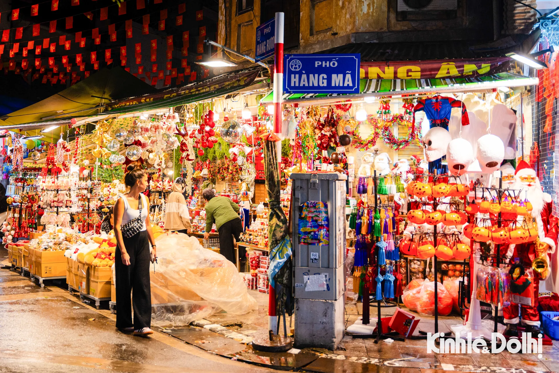 Những ngày này, dọc hai bên phố Hàng Mã, các cửa hàng bày bán những món đồ chơi, đồ trang trí đặc trưng của mùa lễ hội như quả bí ngô, hình nộm phù thủy, mặt nạ ma quái, lồng đèn, mạng nhện...